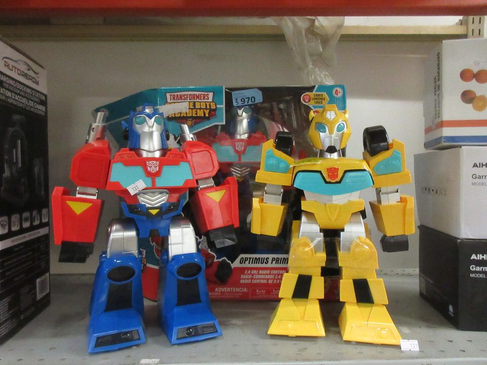 Bumblebee (not in box), Optimus Prime (not in box) and Optimus Prime in open box>