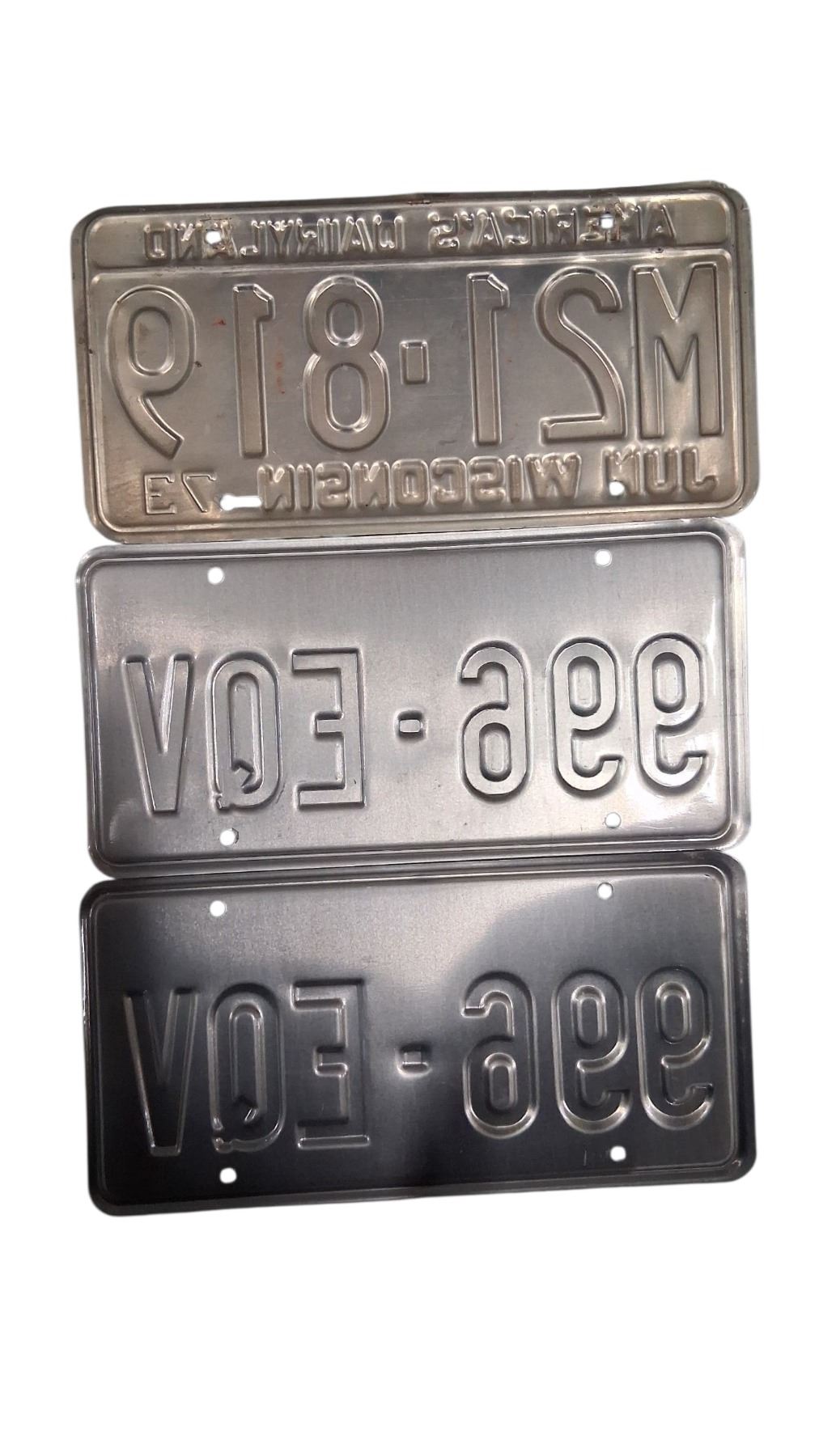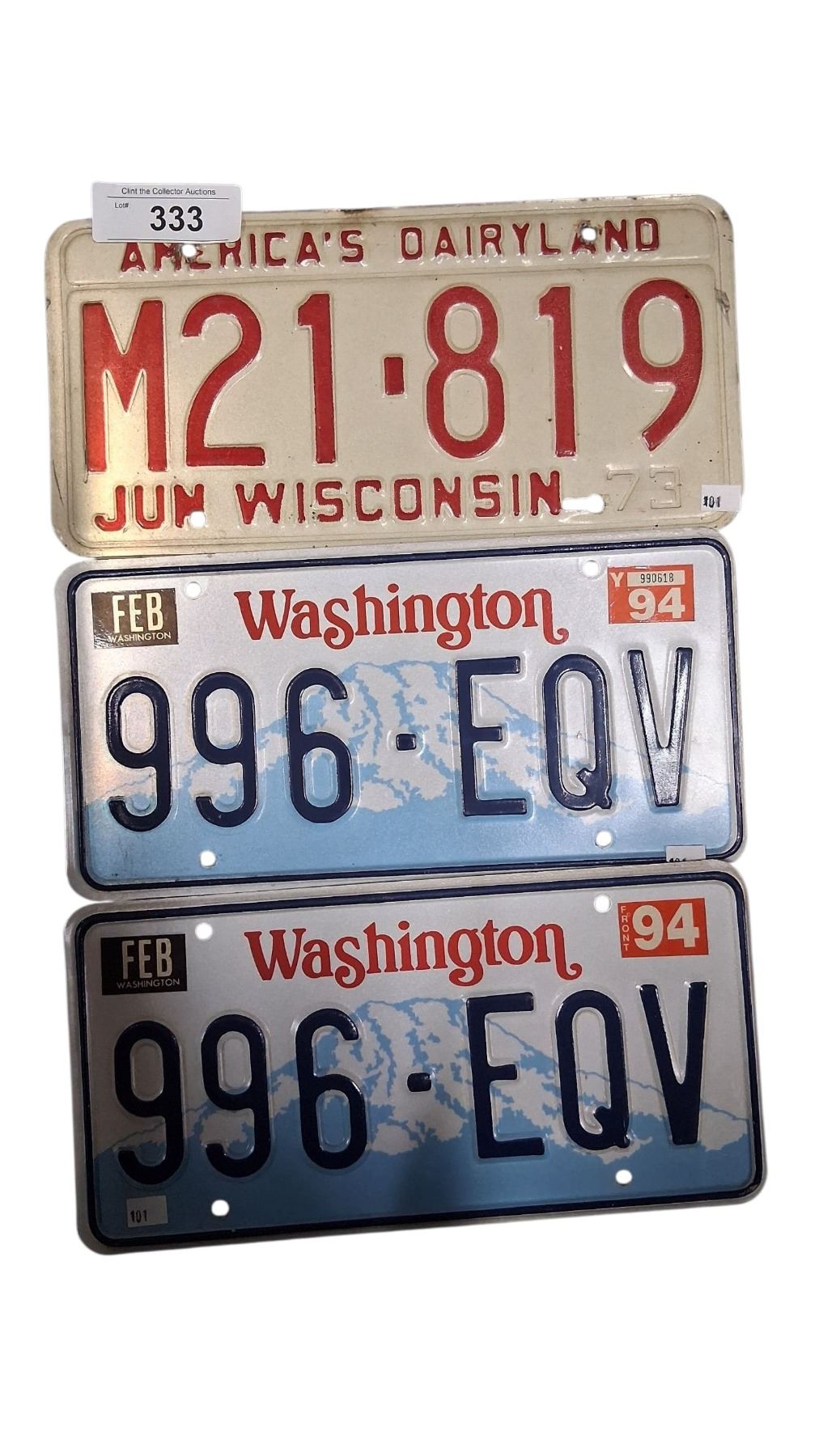 3 US license plates, 73 Wisconsin, 2x94 Washington