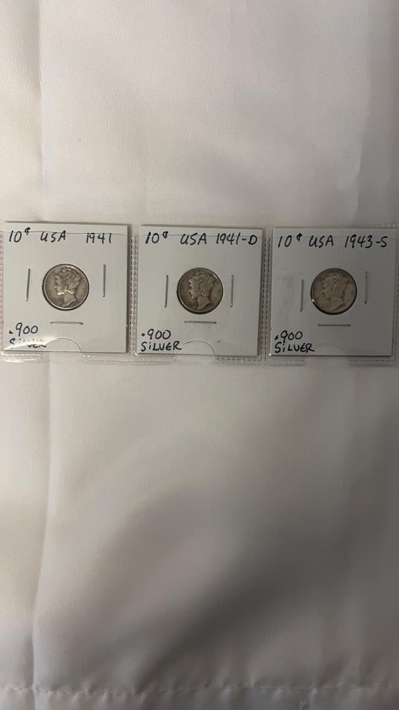 3 USA SILVER (.900) LIBERTY DIMES WWII 1941-1943