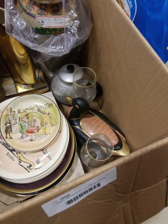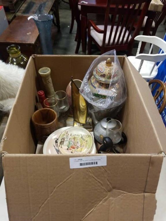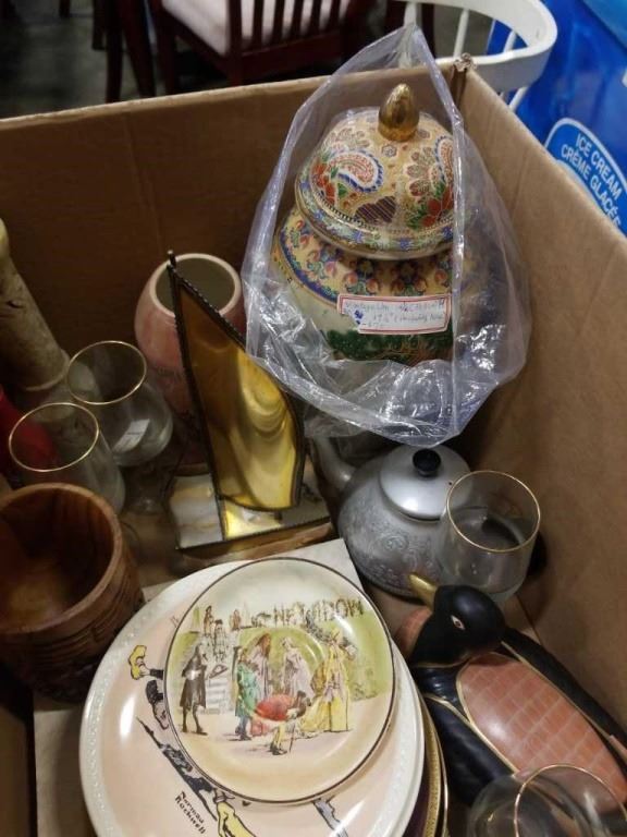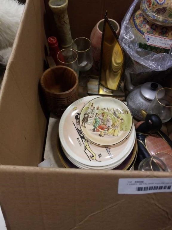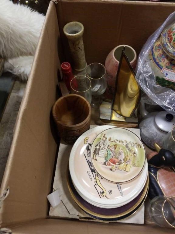 3 VASES, METAL SHIP FIGURE ON STONE BASE, WOOD TIKI MUG, CERAMIC DUCK FIGURE AND COLLECTOR PLATES