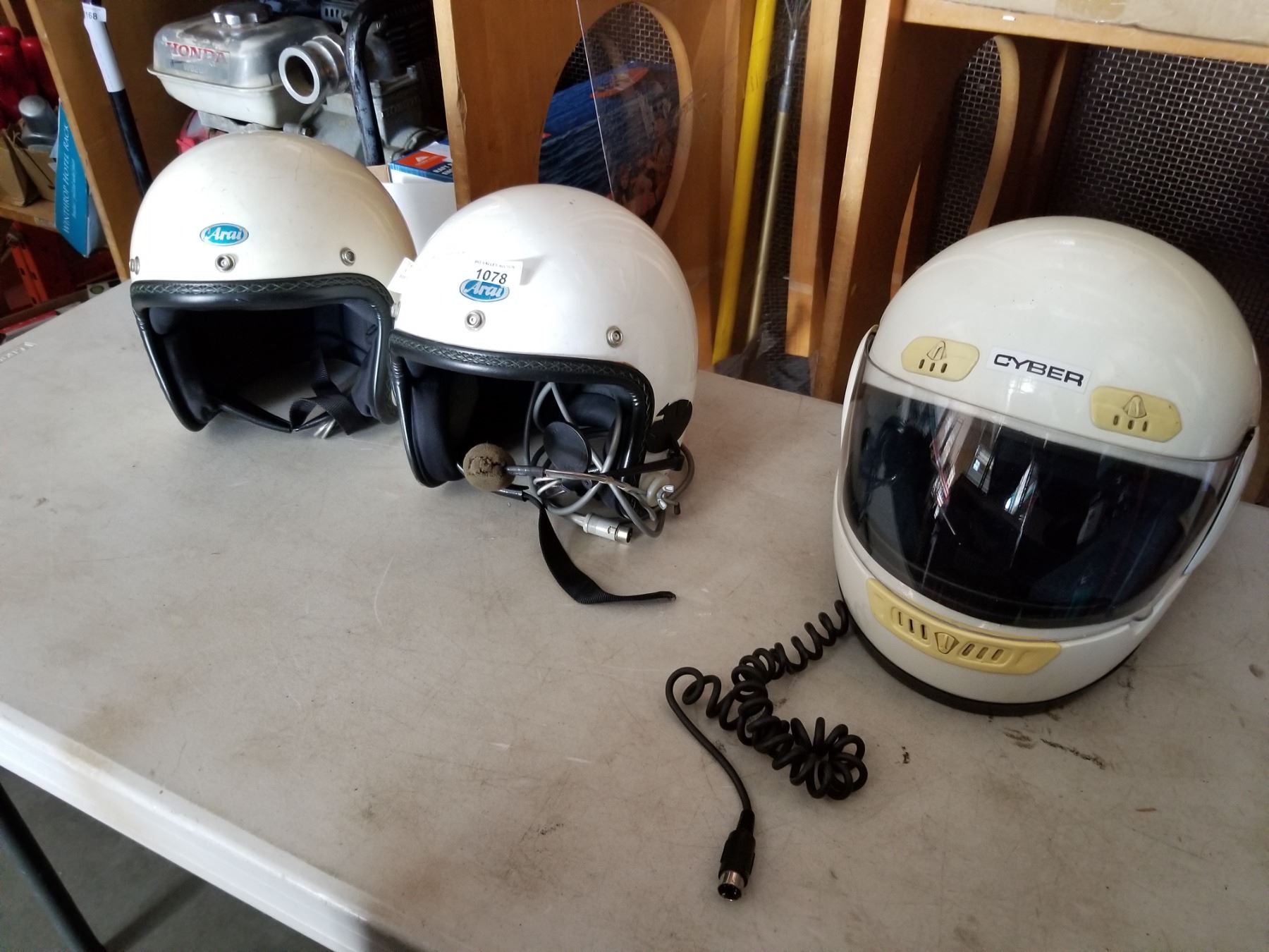 3 VINTAGE ARAI AND CYBER BIKE HELMETS 2 W/ AUDIO