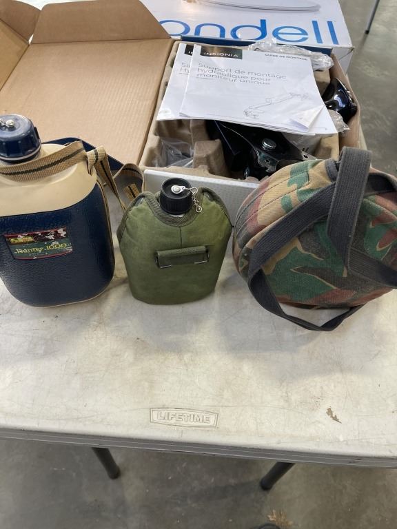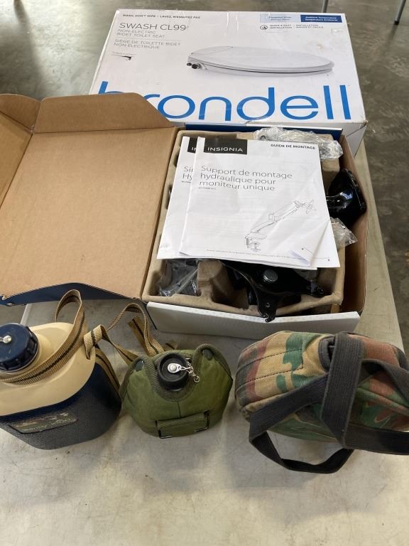 3 VINTAGE CANTEENS, INSIGNIA TV MOUNT, AND BRONDELL TOILET SEAT, STORE RETURNS