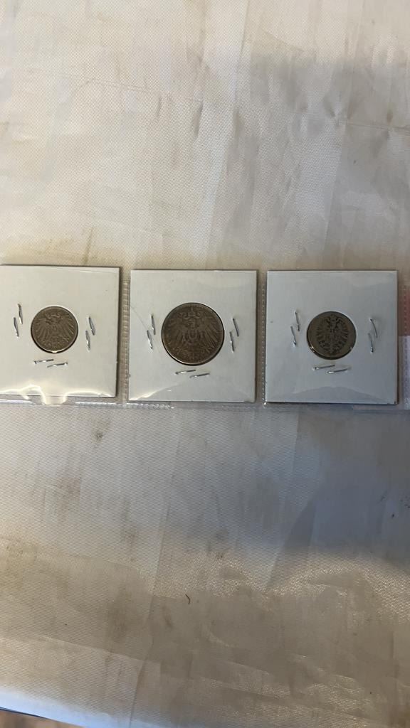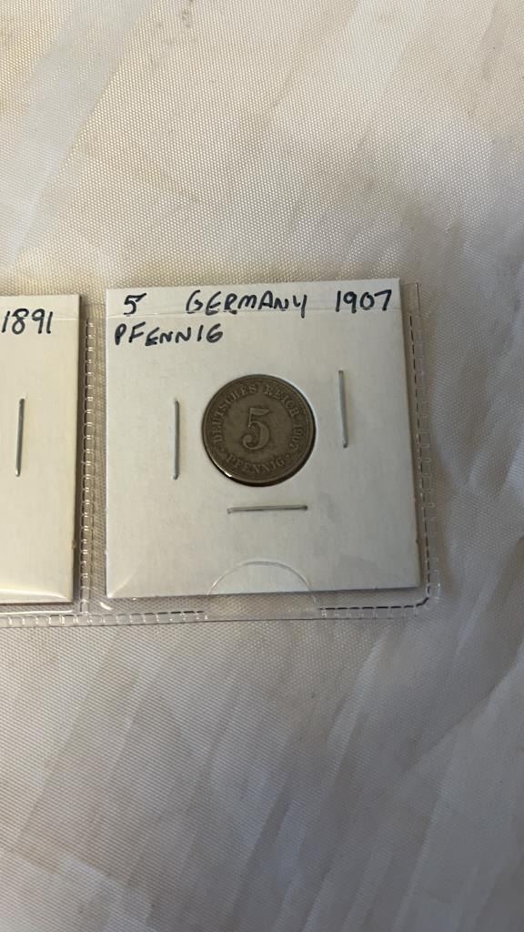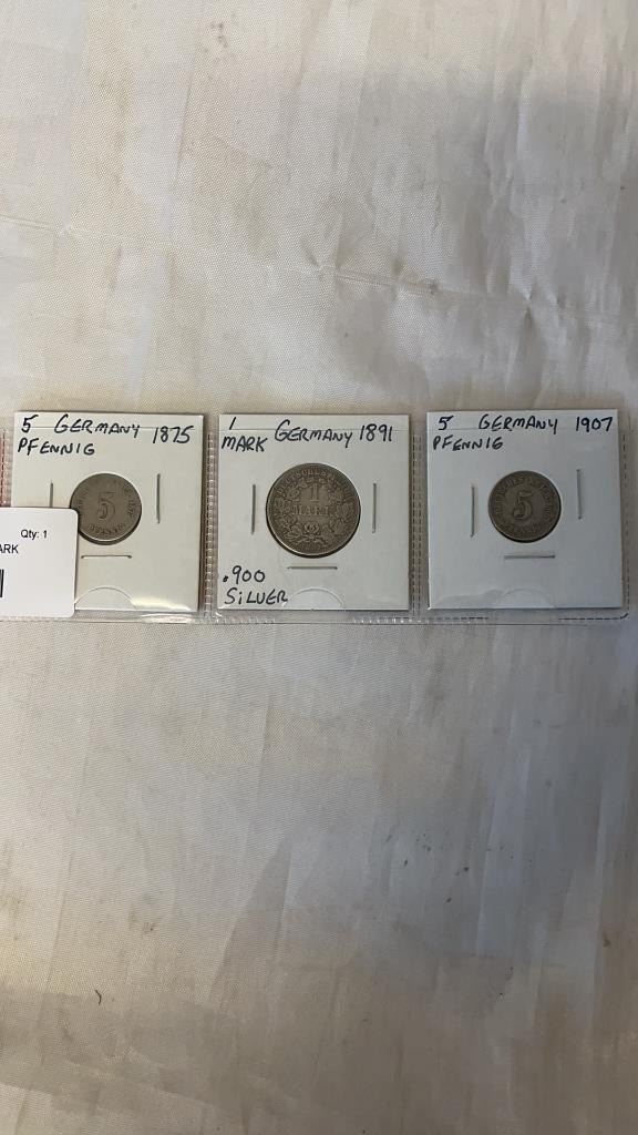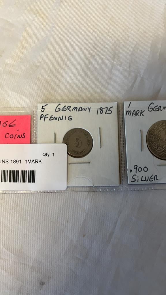 3 VINTAGE GERMAN COINS 1891 1MARK .900 1875, 1907, 5 PFENNIG