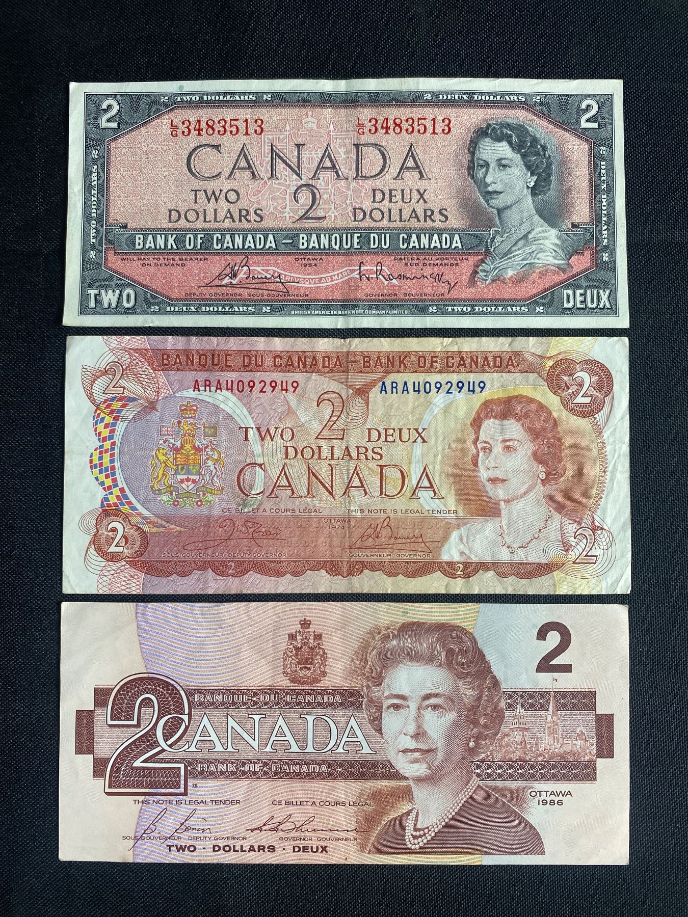 3 Vintage 2 Dollar Canadian Bills - 1954, 1974, 1986