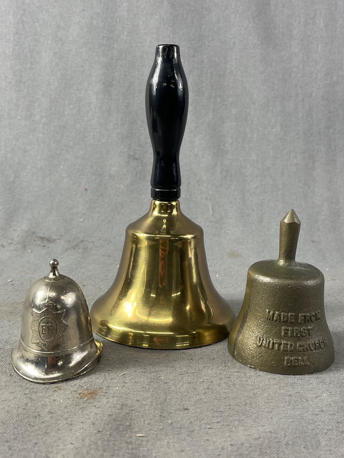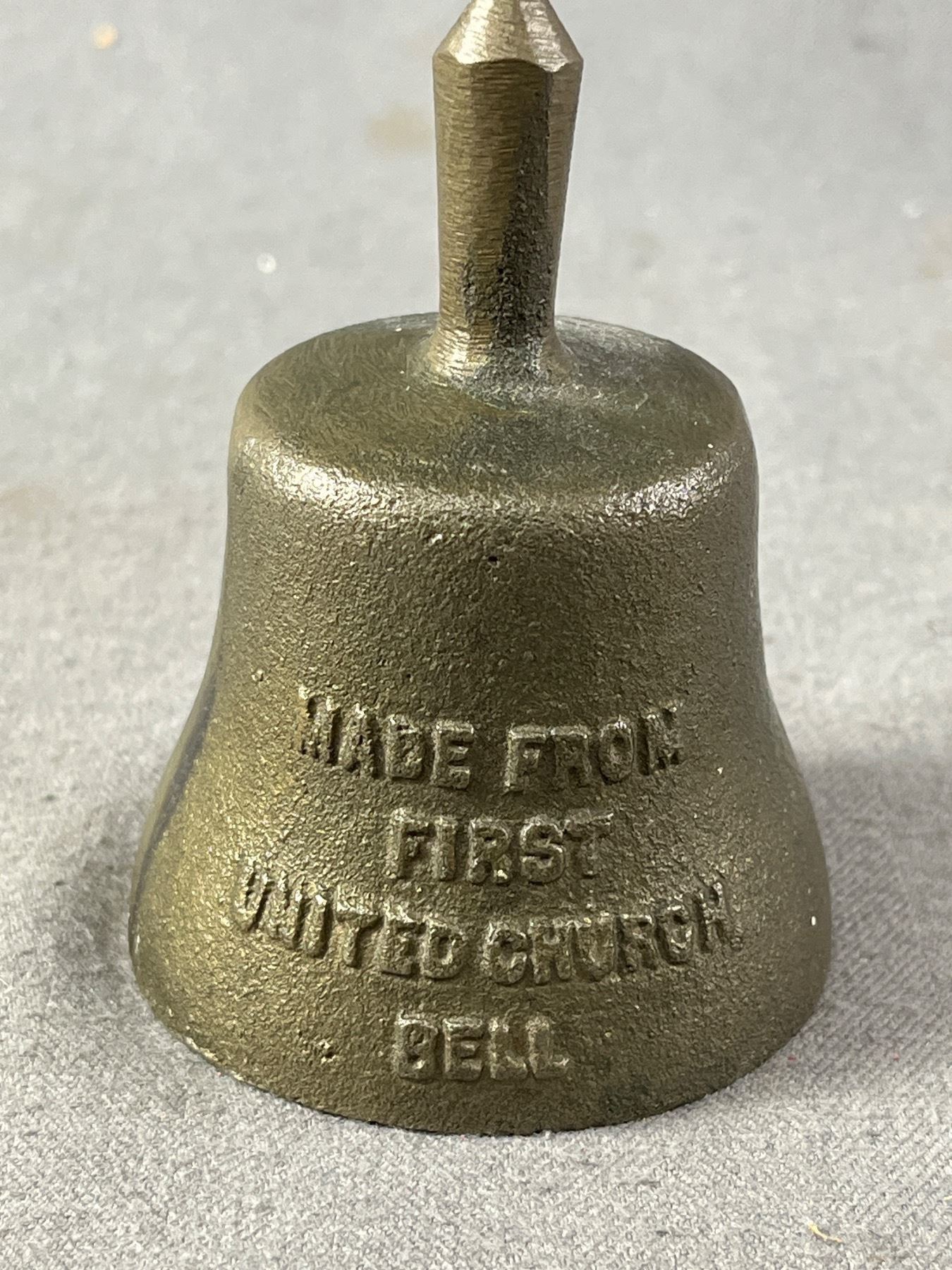 3 Vintage Bells - 2.75" ER, 3.75" Made From First United Church Bell St.Thomas Ont (1875-1940) & 7.5"H School/Church Bell