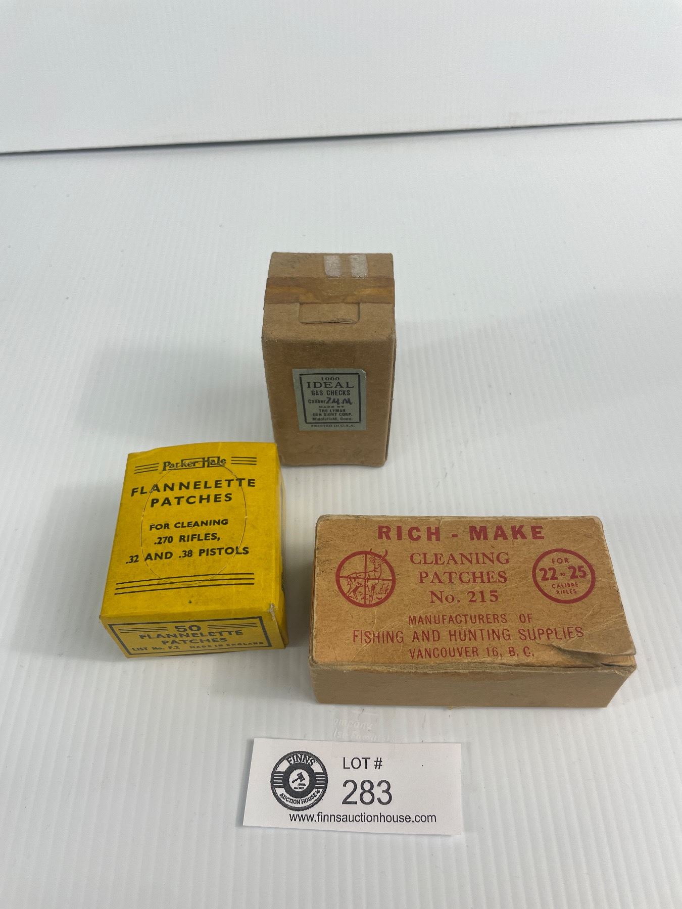 3 Vintage Boxes. Rich-make Cleaning Patches (Empty), Ideal Gas Checks (Empty) & Parker-Hale Cleaning Patches (Full)