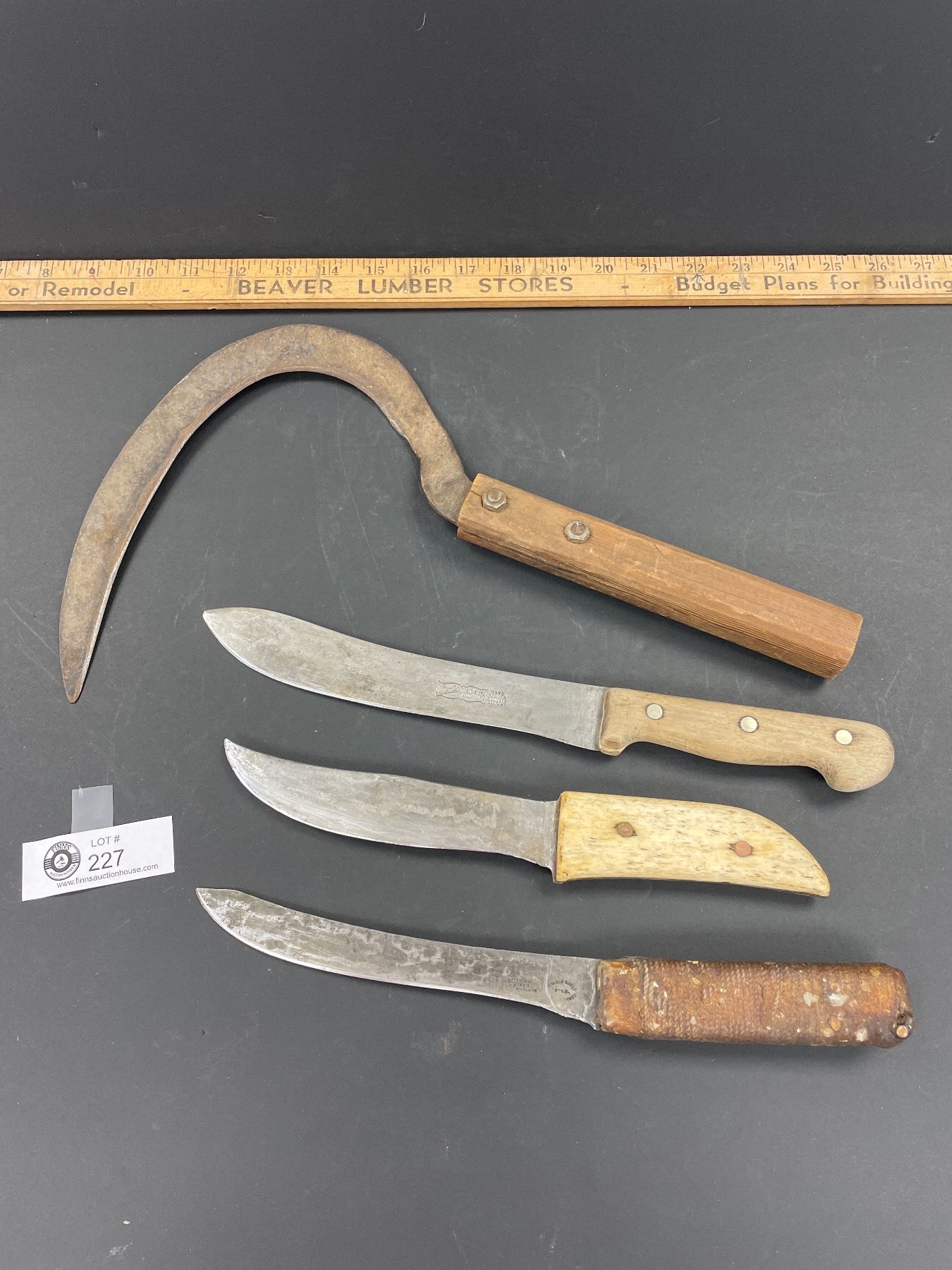3 Vintage Butchering Knives Germany and England and Wooden Handled Scythe