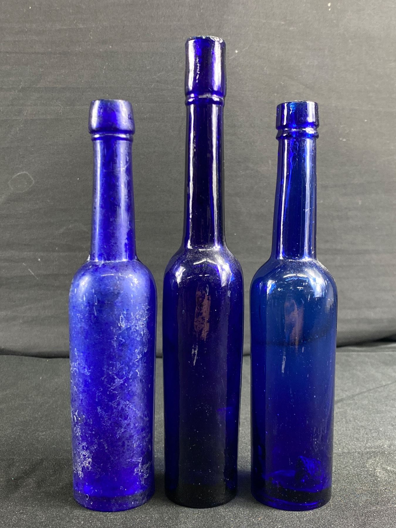 3 Vintage Cobalt Blue Bottles. Approx. 8 1/4" & 9 1/2"