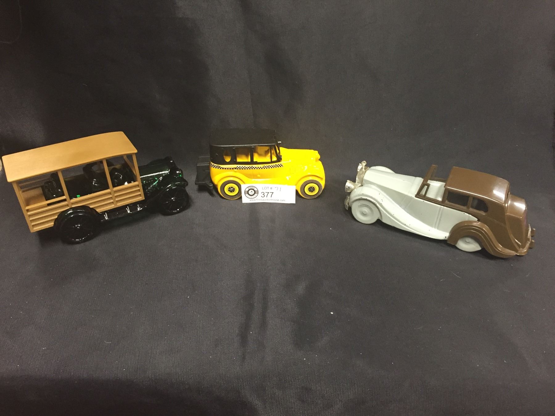 3 Vintage Collector Car Decanters Full of Cologne. Taxi Cab, Rolls Royce Woody Wagon