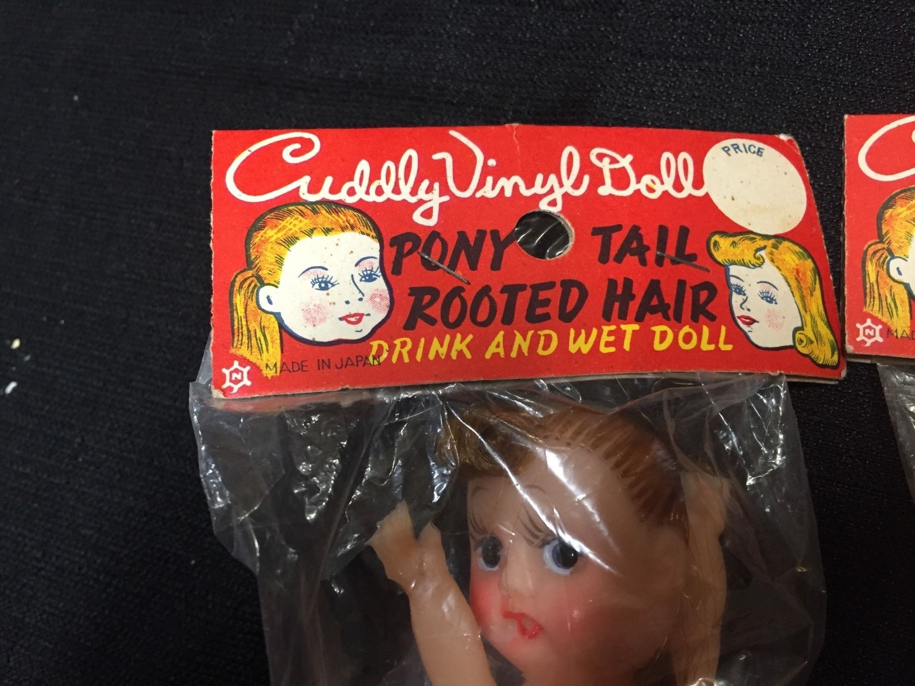 3 Vintage Cuddly Vinyl Dolls. With Ponytail . Rooted Hair. Drink and Wet. All of them in Original Packaging. Never Opened. Made in Japan