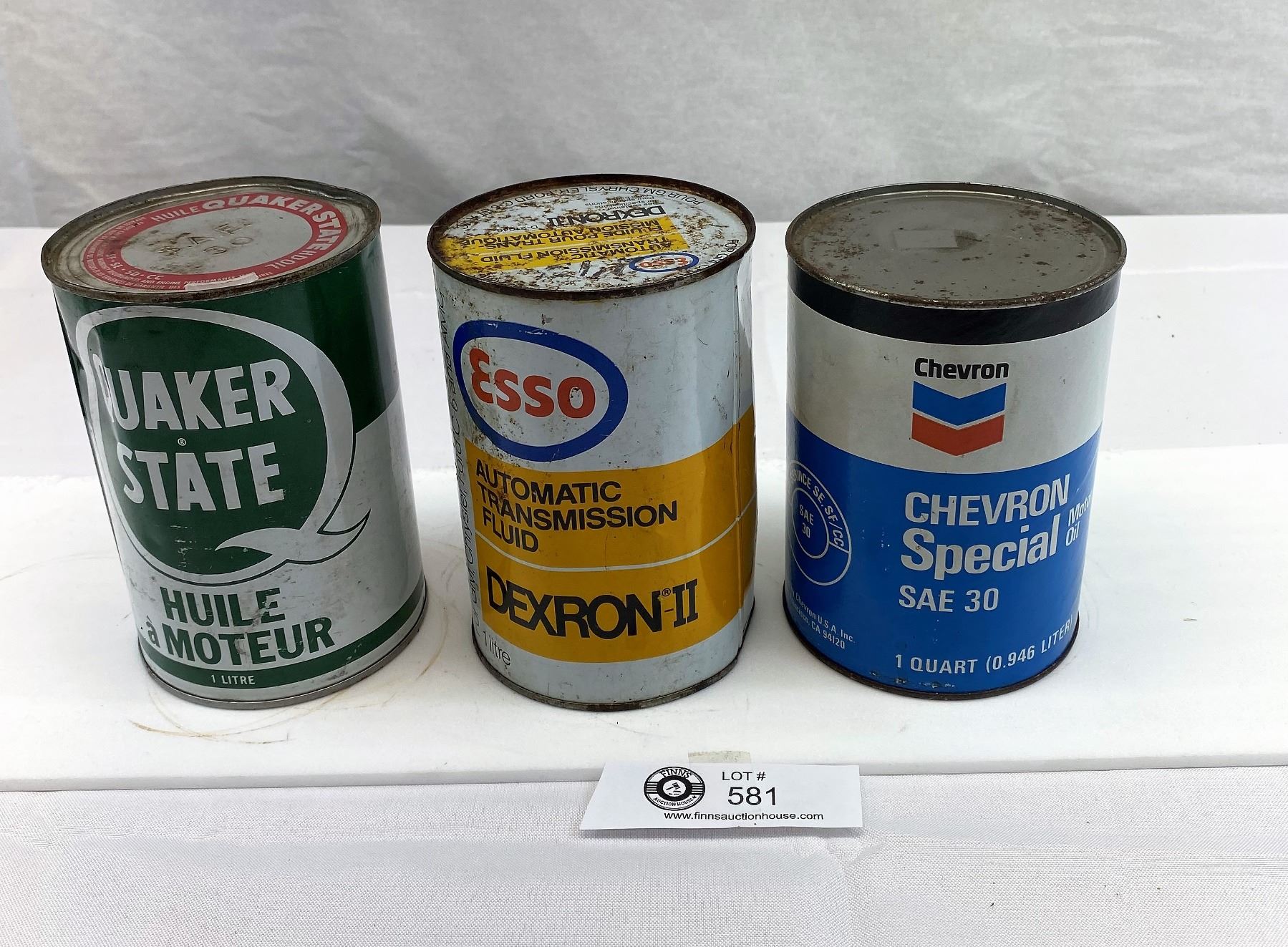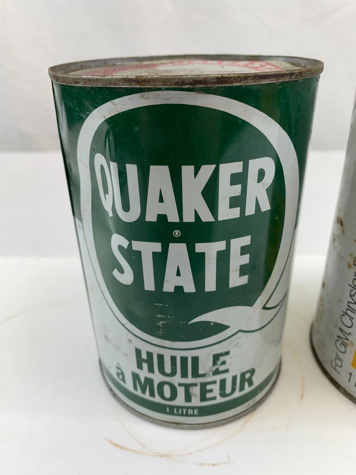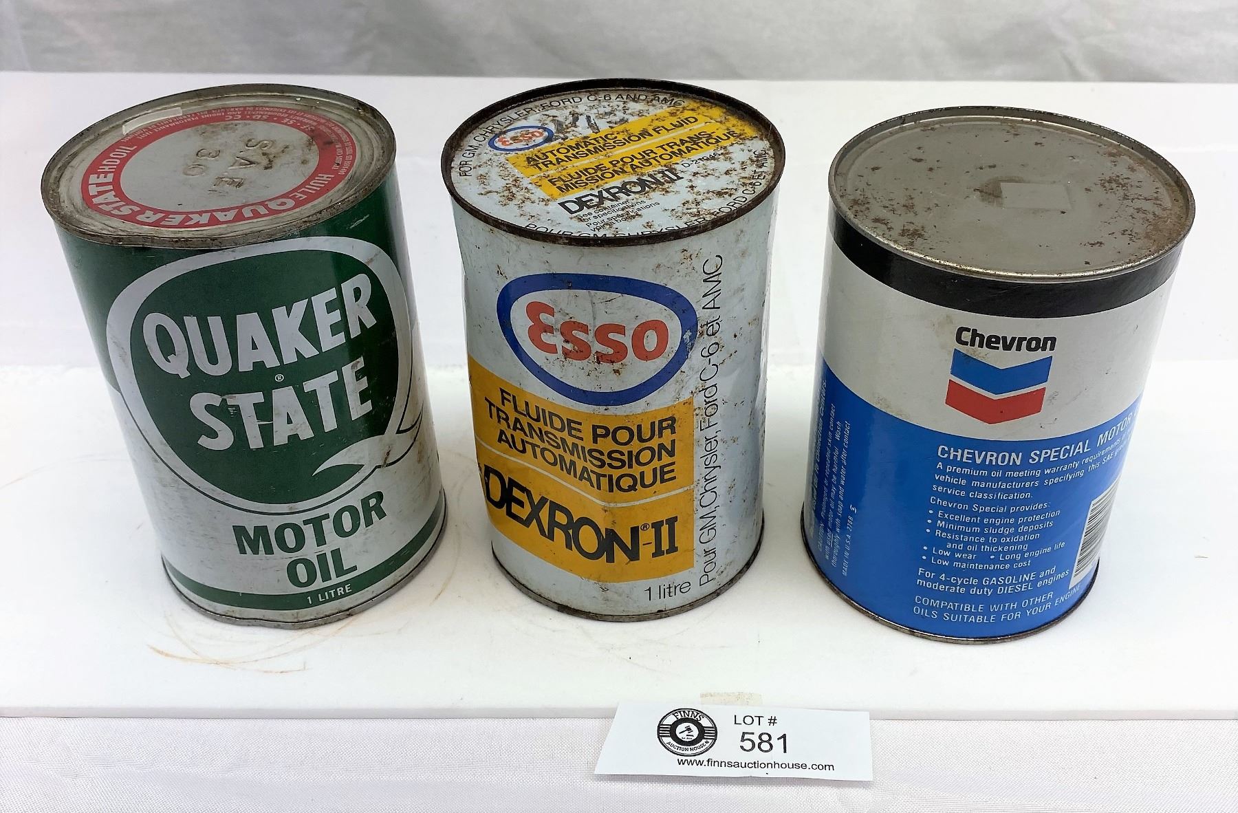 3 Vintage Full Oil Cans, Quaker State, Chevron And Esso
