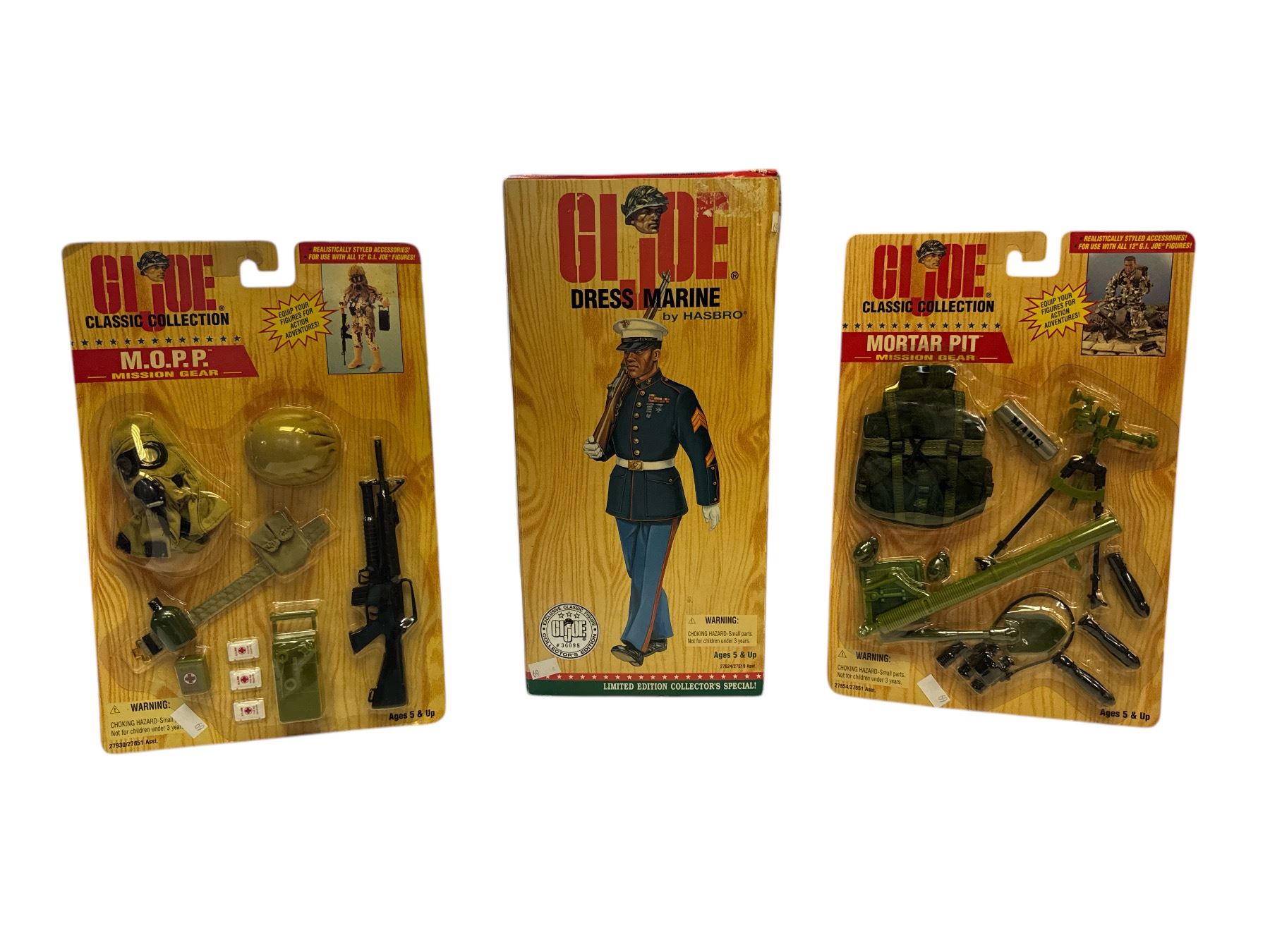 3 Vintage G.I. Joe Toy Collectibles: Mortar Pit Mission Gear, M.O.P.P. Mission Gear & Dress Marine. Rare African American GI Joe.