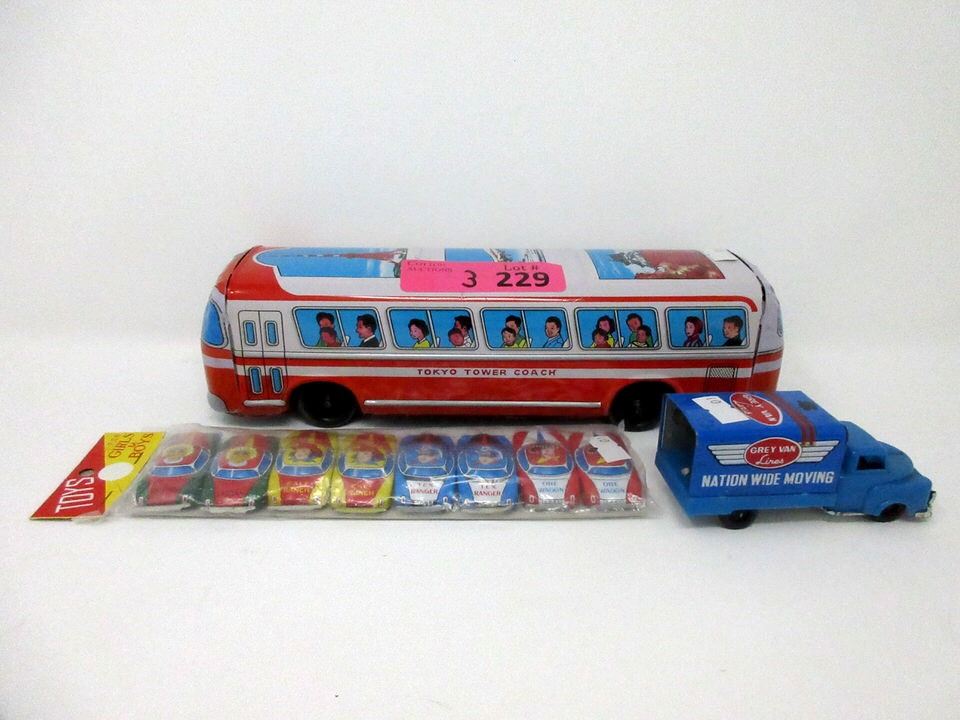 Tokyo Tower Coach (3 x 12 x 3"), Set of 8 Mini Tin Race Cars, and Grey Van Miniature truck.