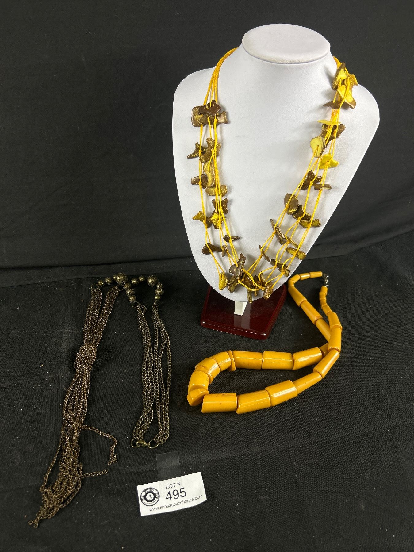 3 Vintage Necklaces - Multi-strand Yellow Cord Bohemian Style, Yellow Cylinder Beads & Multi-Chain Beaded Tassel