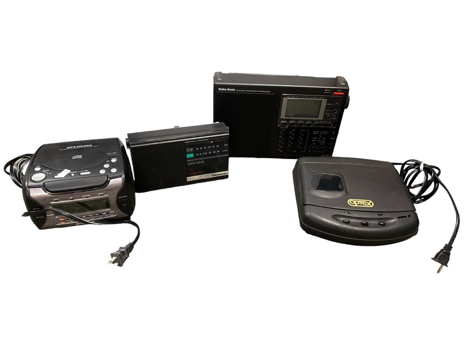 3 Vintage Radios And Type Rewinder, Panasonic, Radio Shack, Sylvania, And Optex