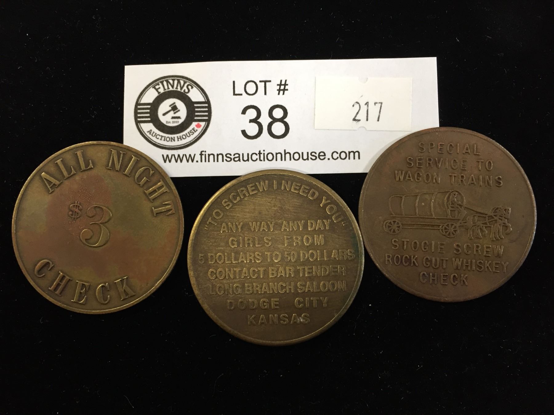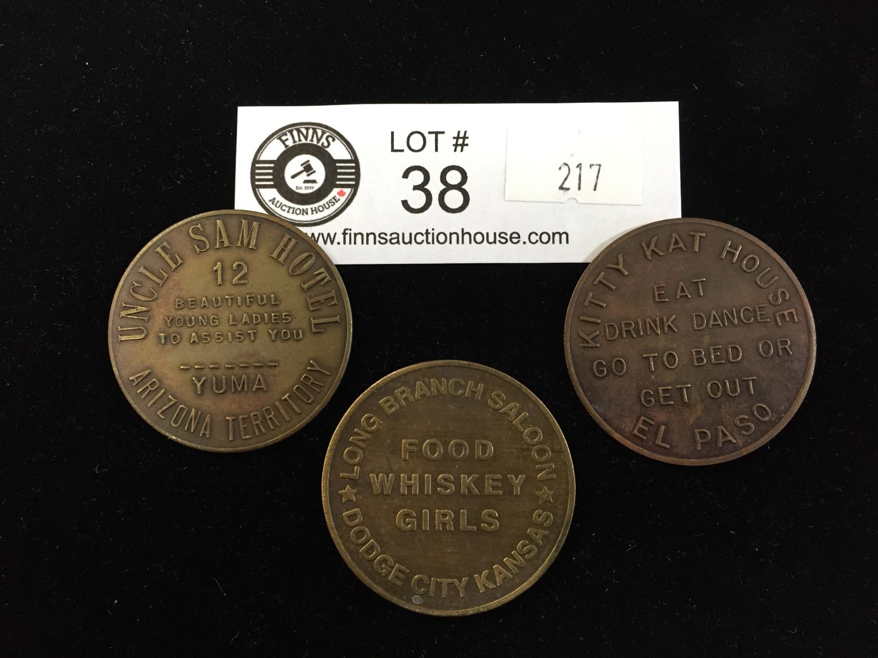 3 Vintage Saloon Tokens Uncle Sam Hotel, ( Arizona) Kitty Kat House,( El Paso, Rx) and Long Branch Saloon (Dodge City)