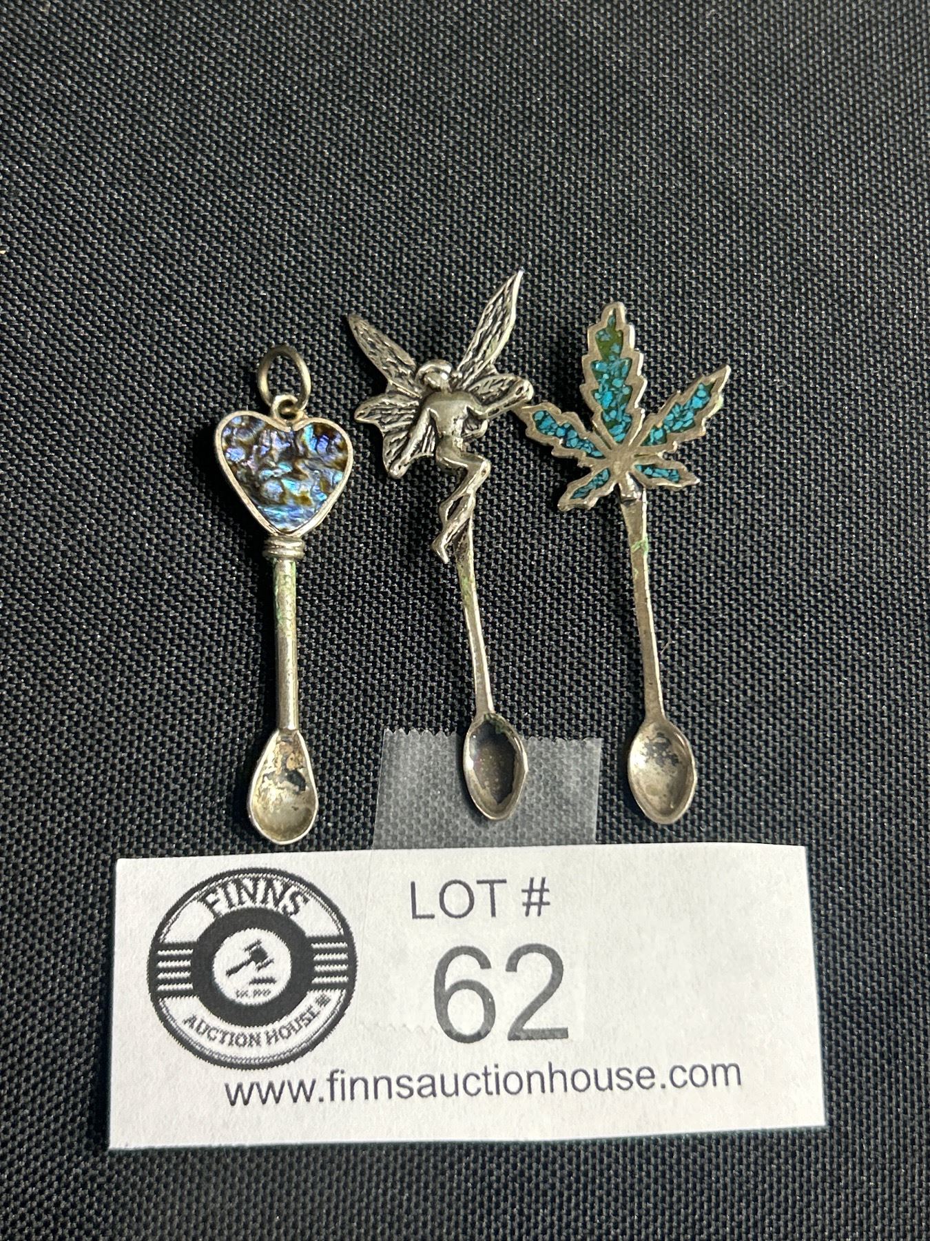 3 Vintage Small Sterling Pendant Spoons (turquoise, abalone inlay)