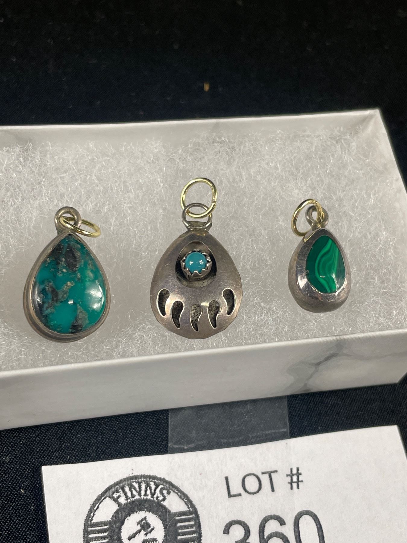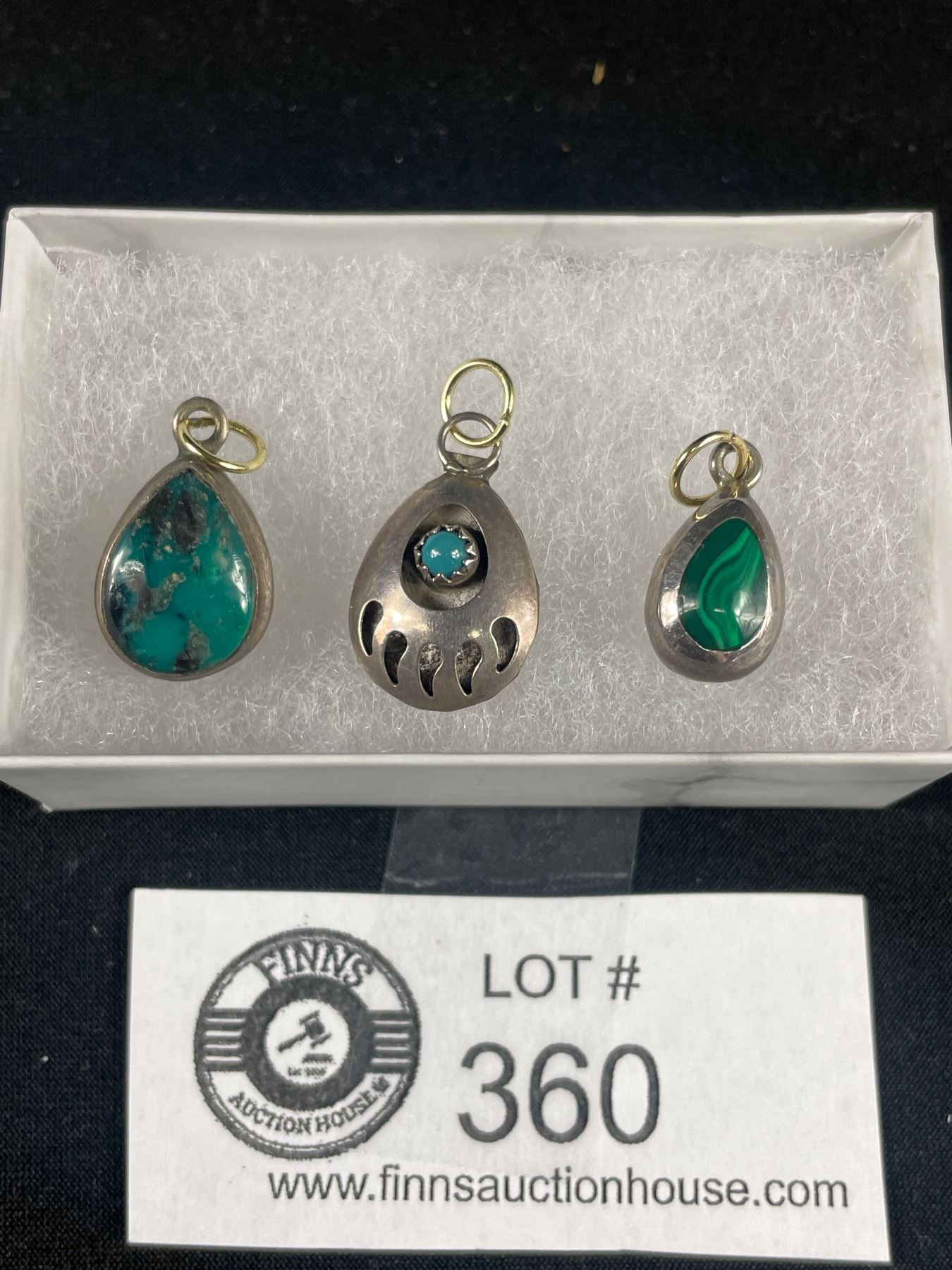 3 Vintage Sterling Silver with Turquoise Stone Pendants. 1 Bear Claw Design