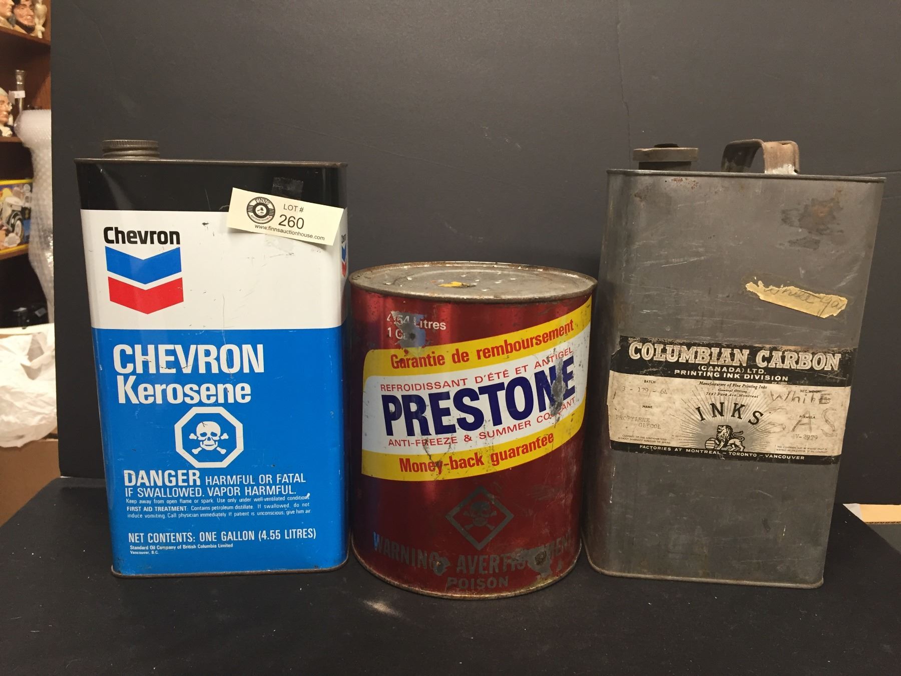 3 Vintage Tins. Cheveron Kerosene 1 Gallon Cans. A Prestone Antifreeze Tin 2L and a Columbian Carbon Canada Limited Tin