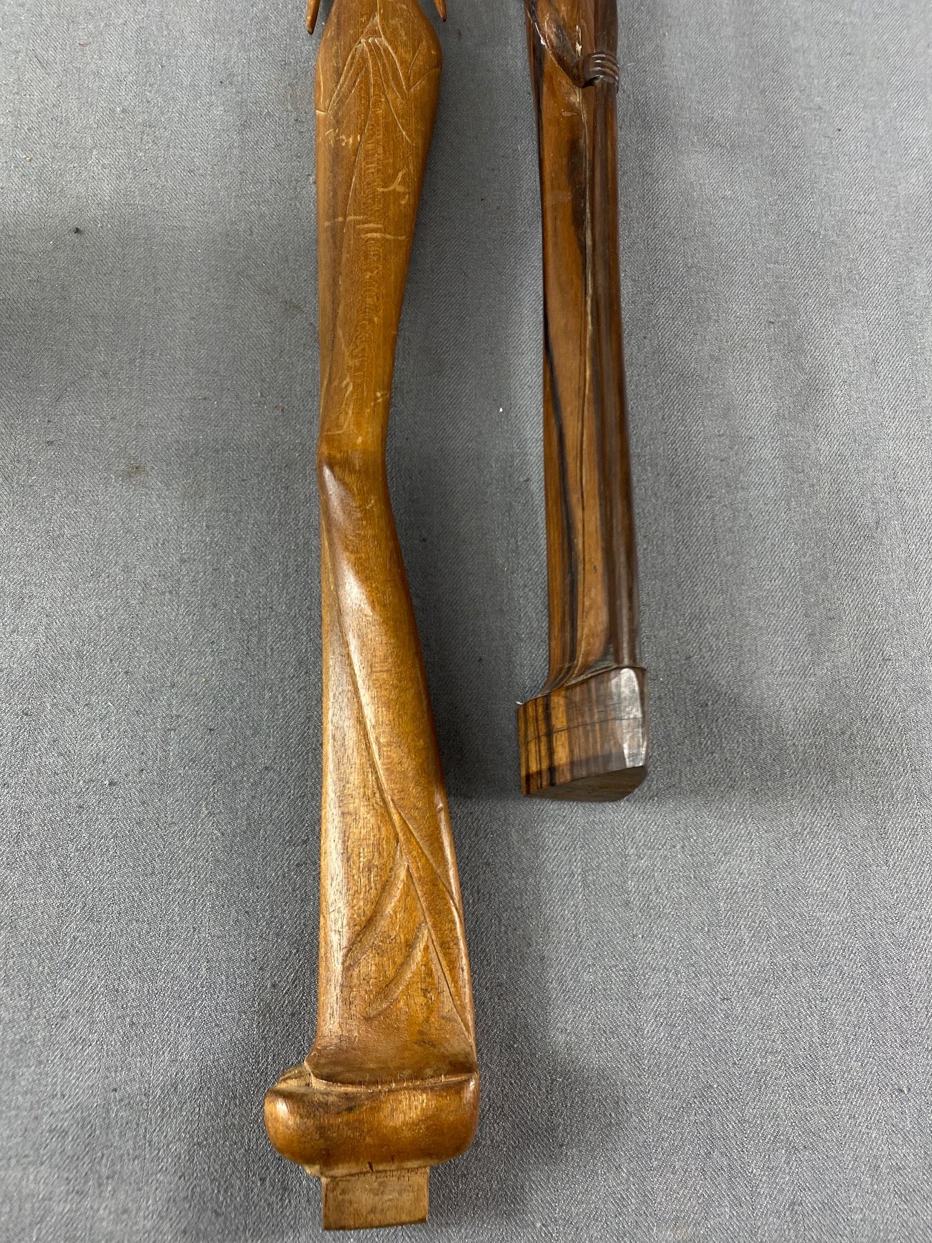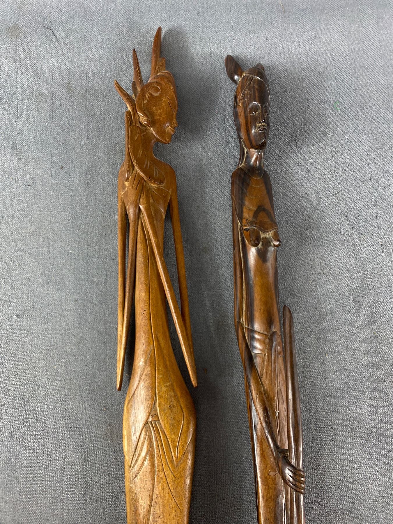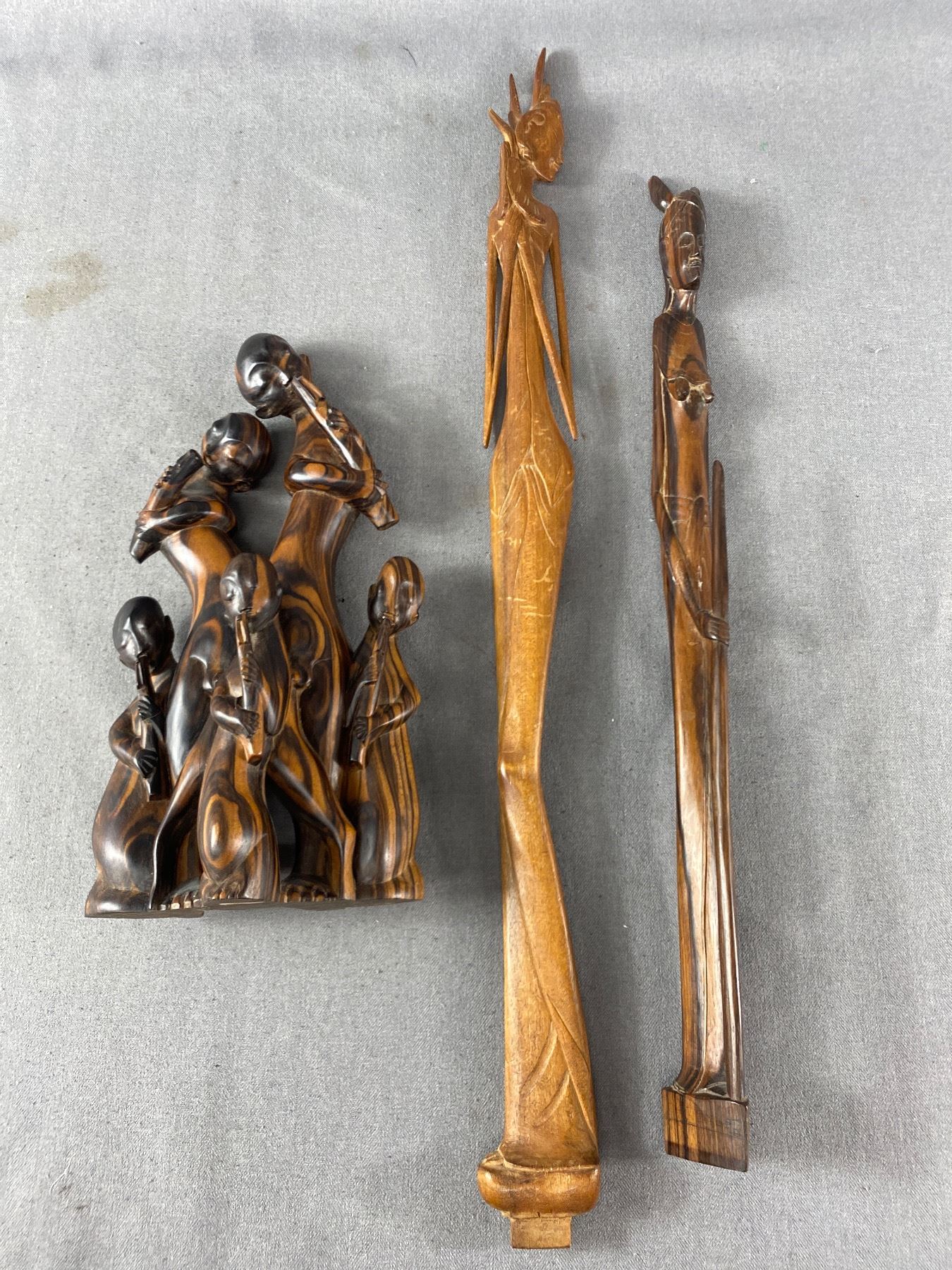 3 Vintage Wood Carvings African Figurines. Approx. 20 1/2" H & 25 1/2" H & Musician Family Approx. 12"