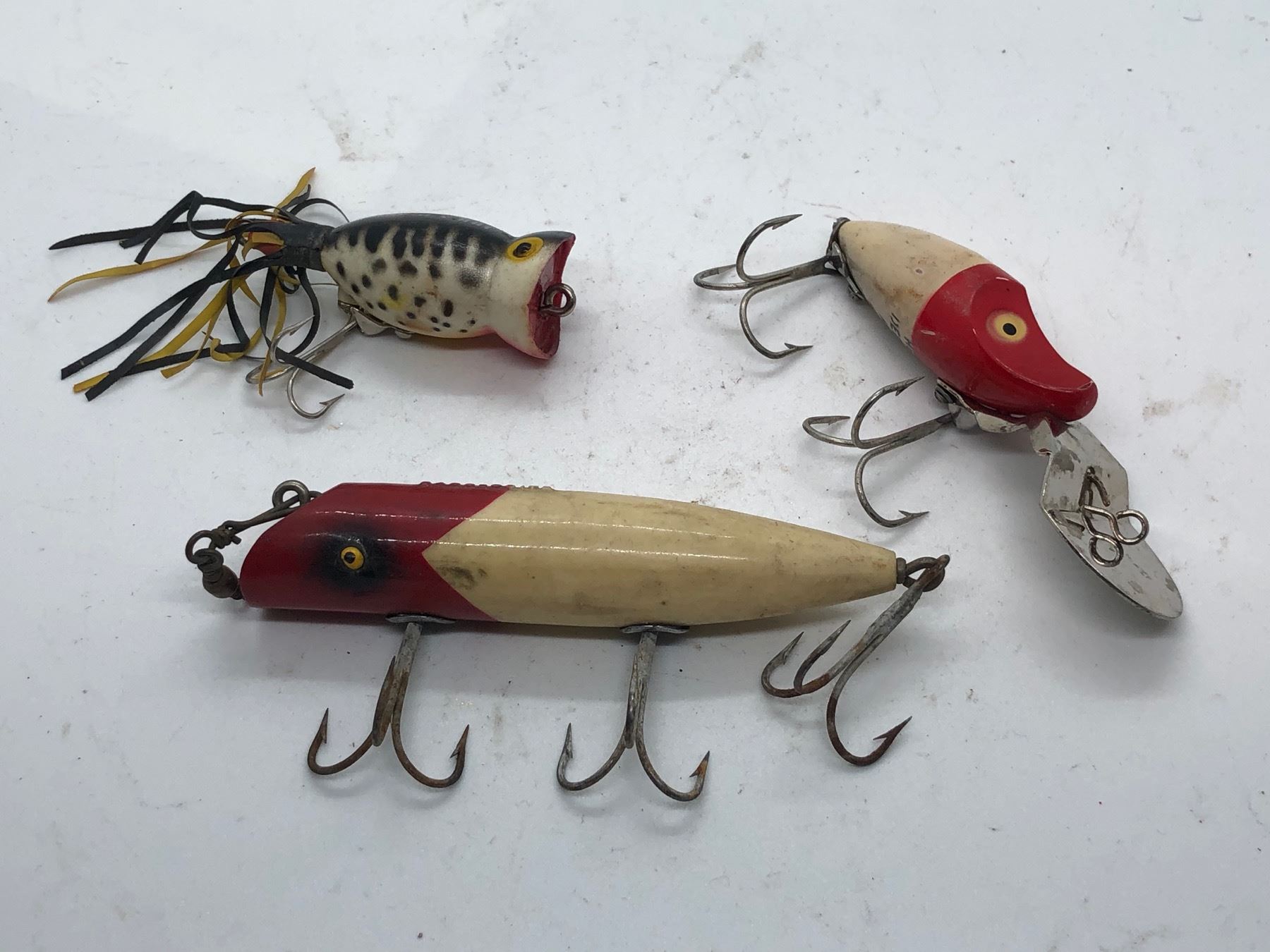 3 Vintage fishing lures - Bass-Obite/Hula Popper & Heddon deep dive river runt