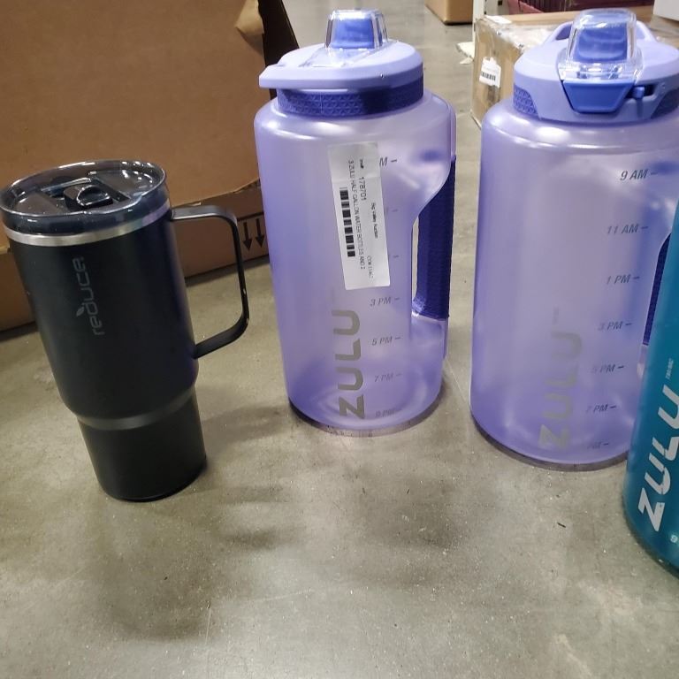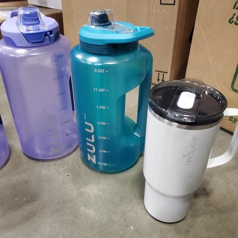 3 ZULU HALF GALLON WATER BOTTLES AND 2 REDUCE INSULATED TRAVEL MUGS