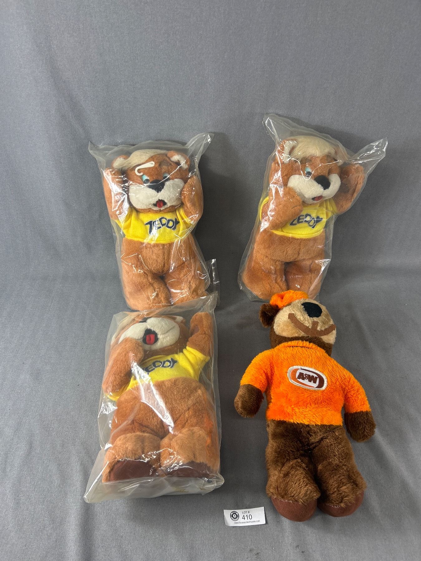 3 Zeller's Plush Zeddy Bears Plus A & W Root Bear. Approx. 16" & 18"