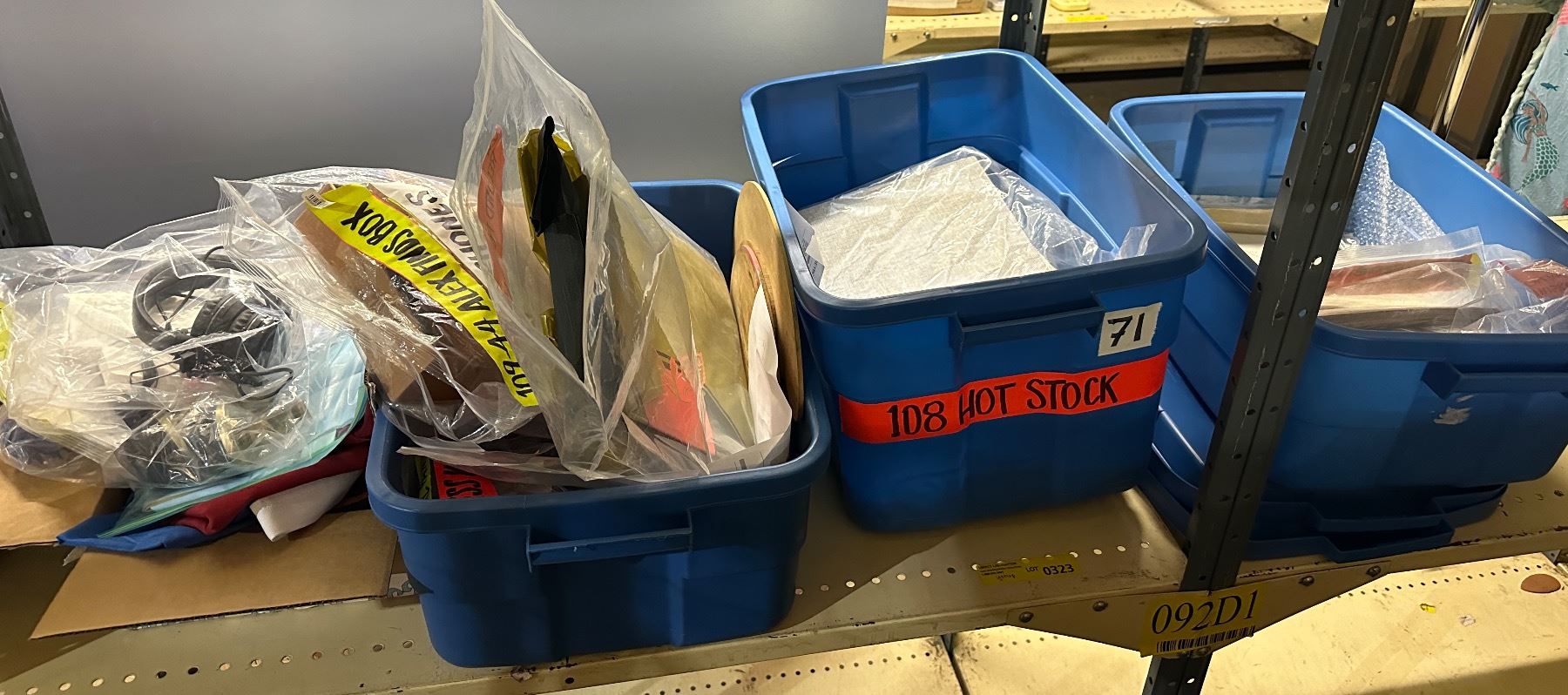 3. bins of misc items including - flags, sewing kit, painting gear, whisky glasses, misc paperwork,