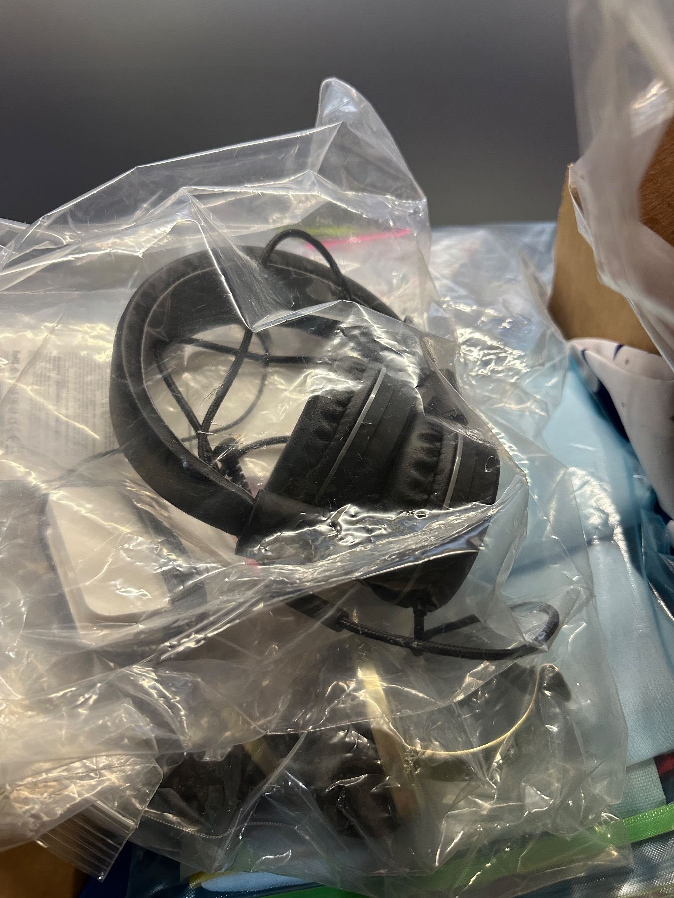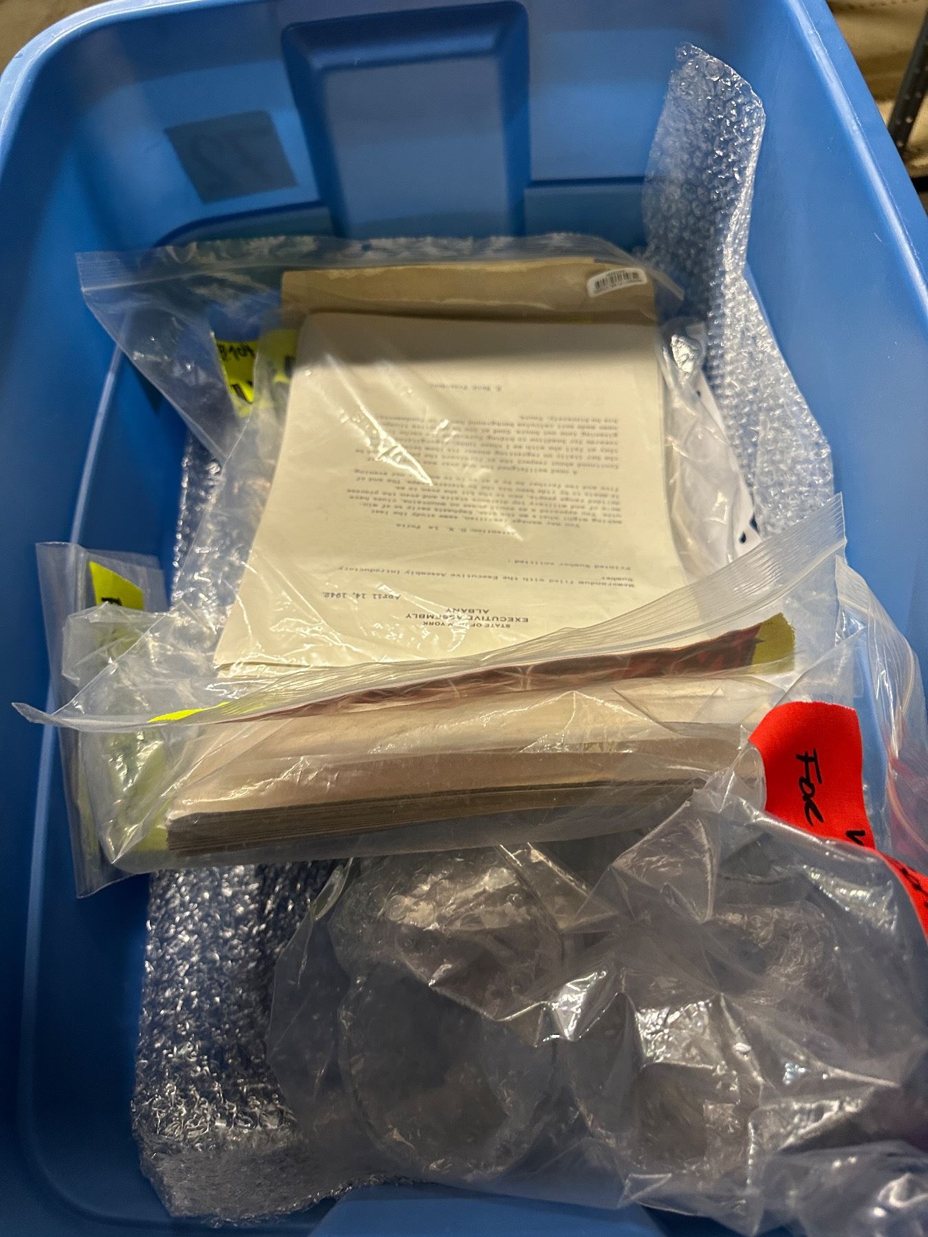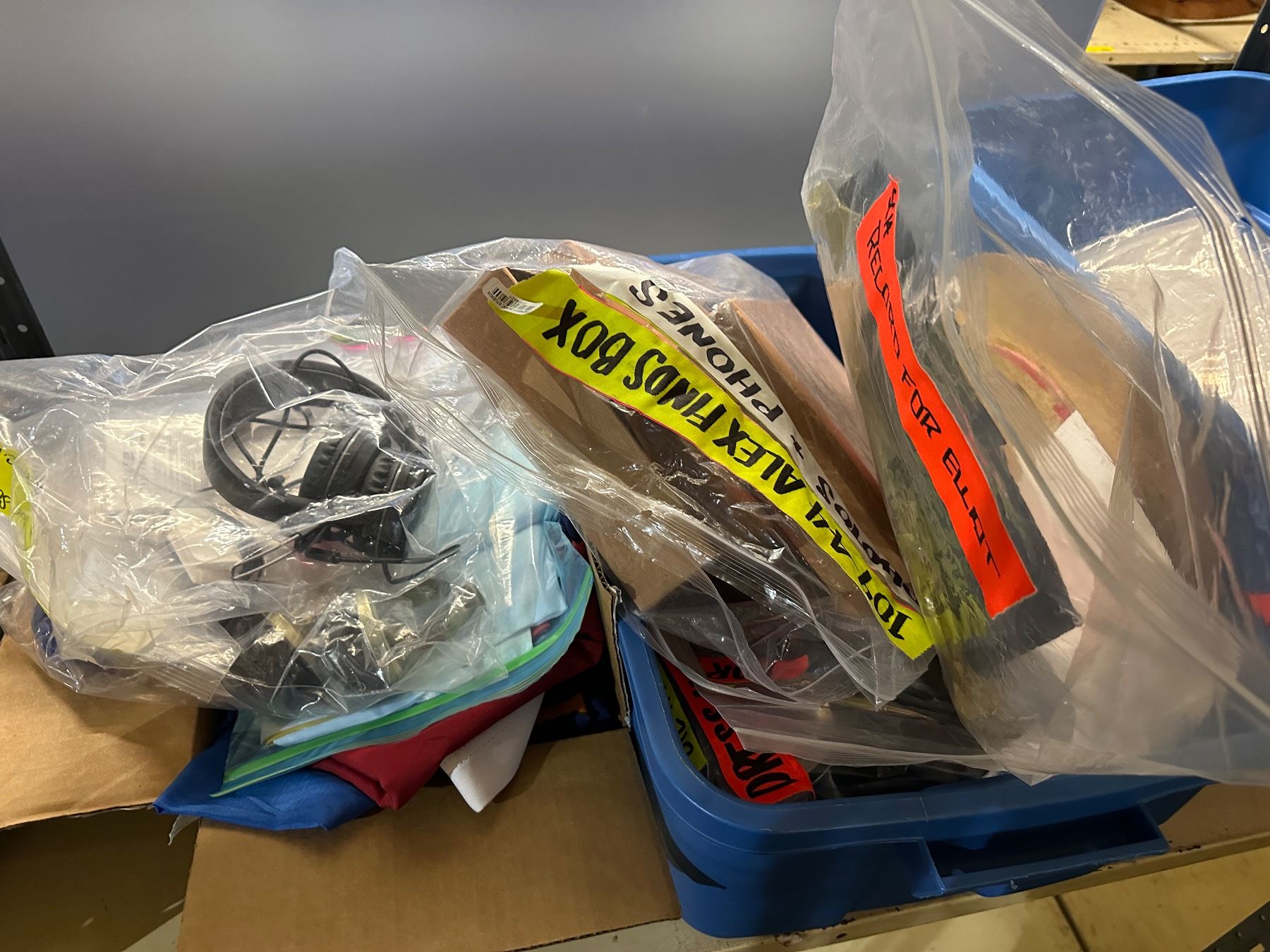 3. bins of misc items including - flags, sewing kit, painting gear, whisky glasses, misc paperwork, etc...