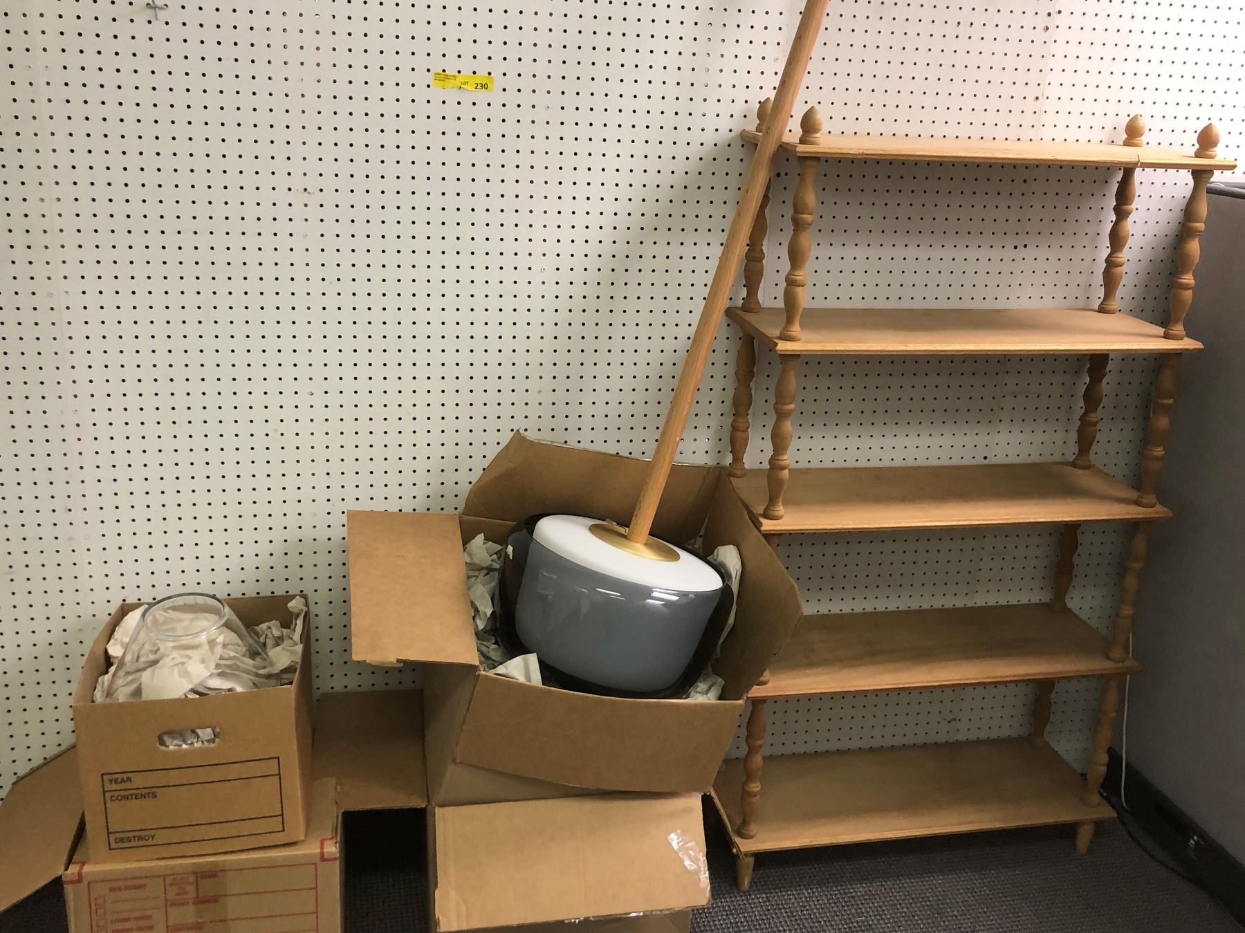 3 boxes of Glassware, Light & Wood Shelving Unit