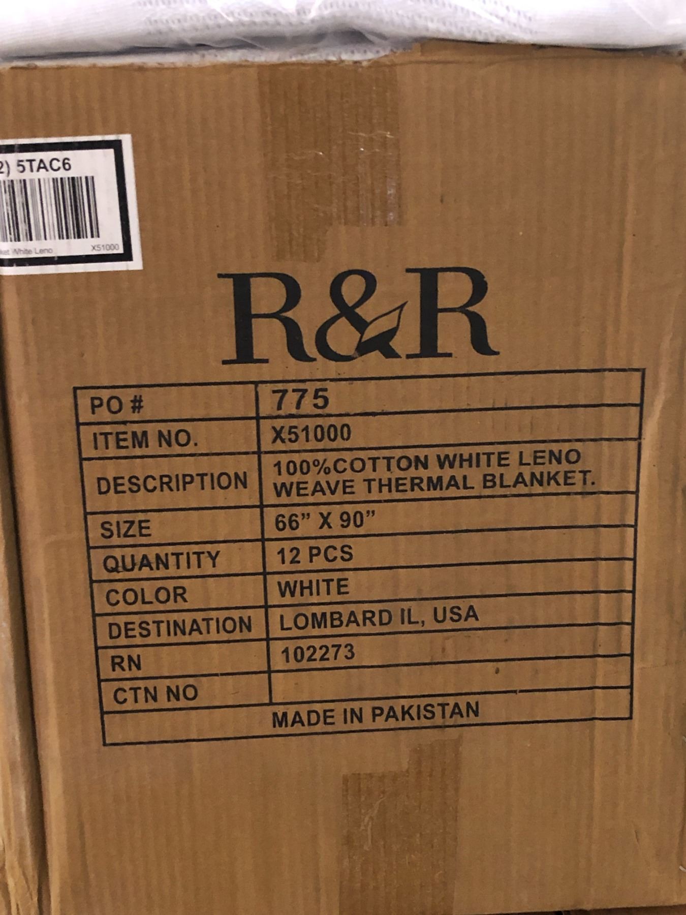 3 boxes of R&R White Leno weave thermo blanket (approx 66in x 90in) - model X51000 (Approx 12pcs per box)