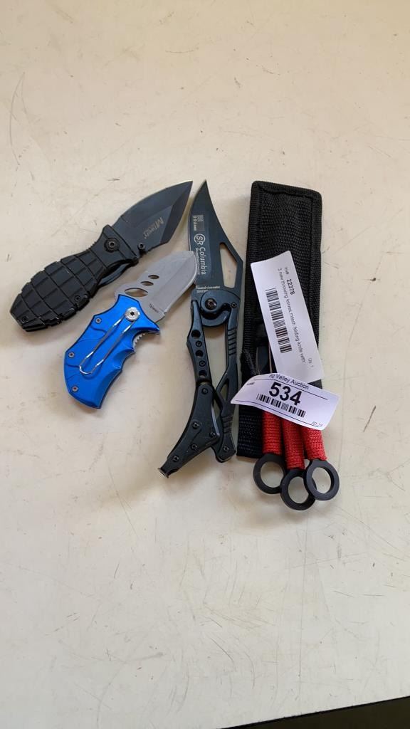 3 new throwing knives,mtech folding knife with buker and columbia folding knives