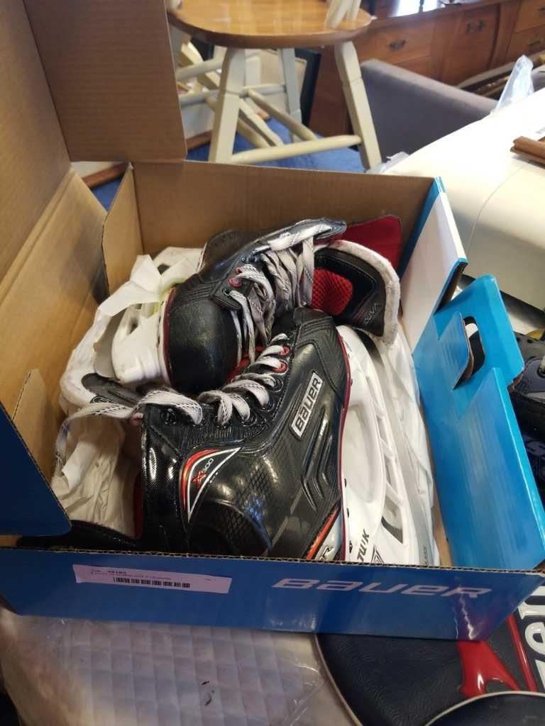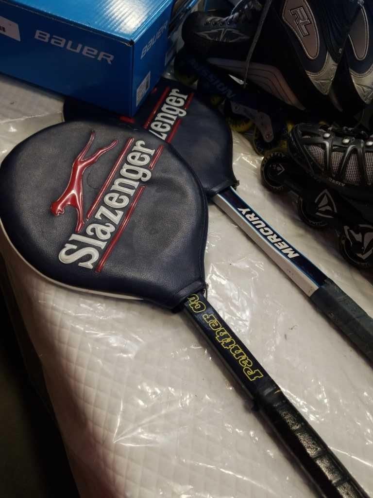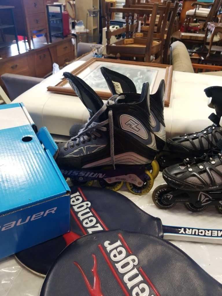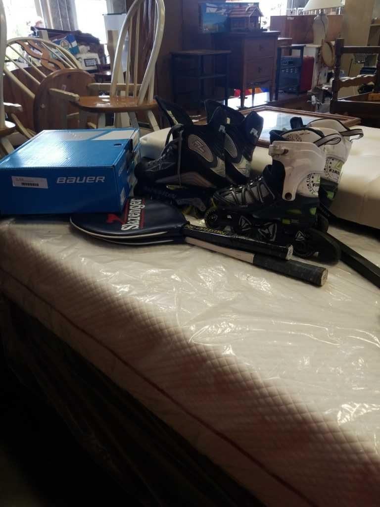 3 pairs of skates and 2 racquets