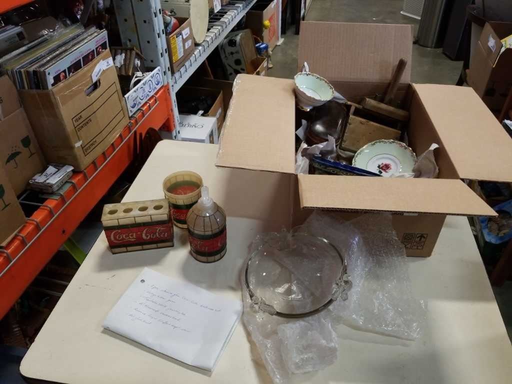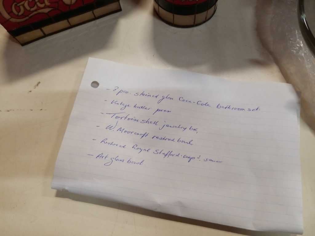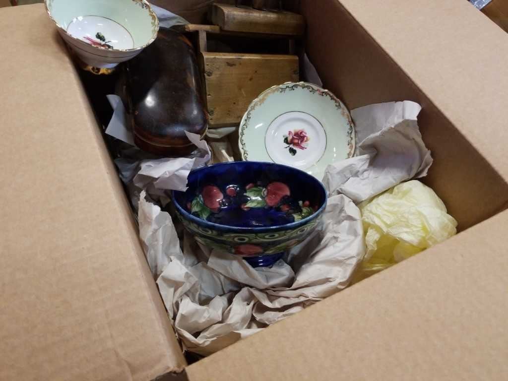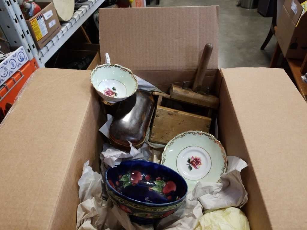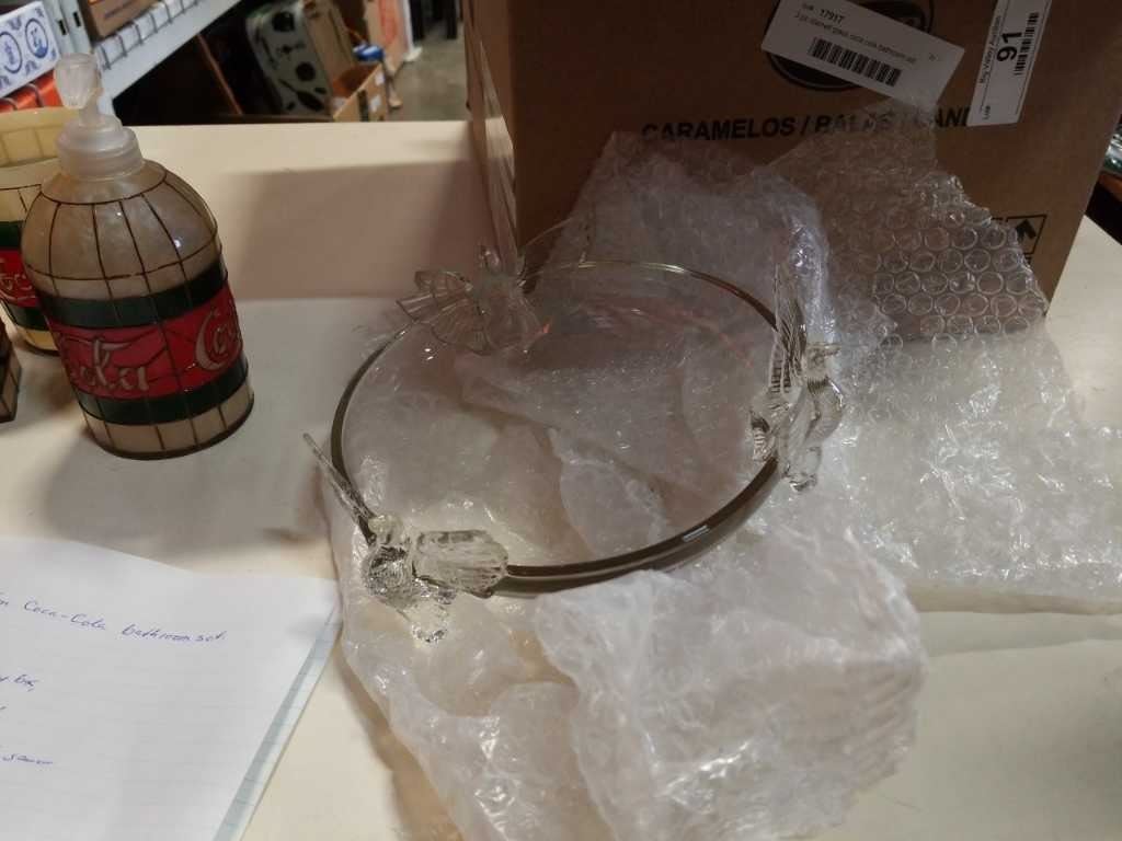 3 pc stained glass coca cola bathroom set, vintage butter press, tortoise shell jewelry box, Moorcroft restored bowl, stafforshire cup and saucer & art glass bowl