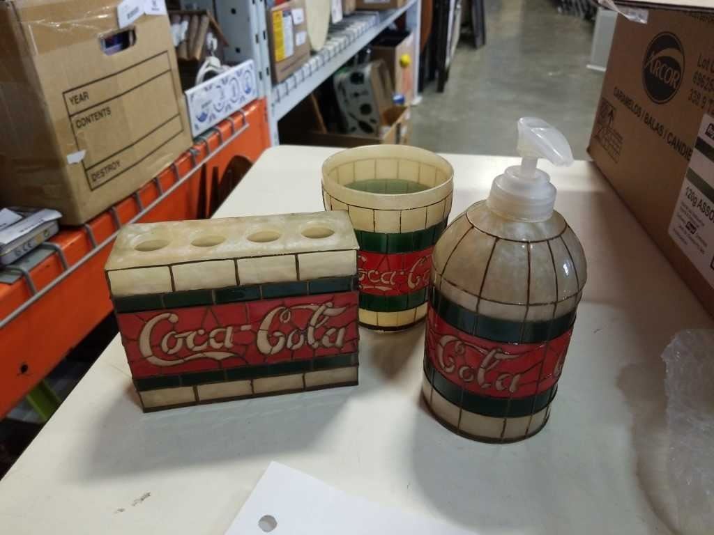 3 pc stained glass coca cola bathroom set, vintage butter press, tortoise shell jewelry box, Moorcro