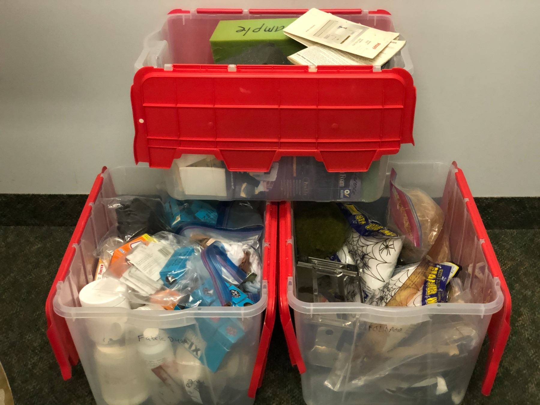 3 plastic storage bins from special effects studio - foliage/ foam samples & assorted industry-related work materials
