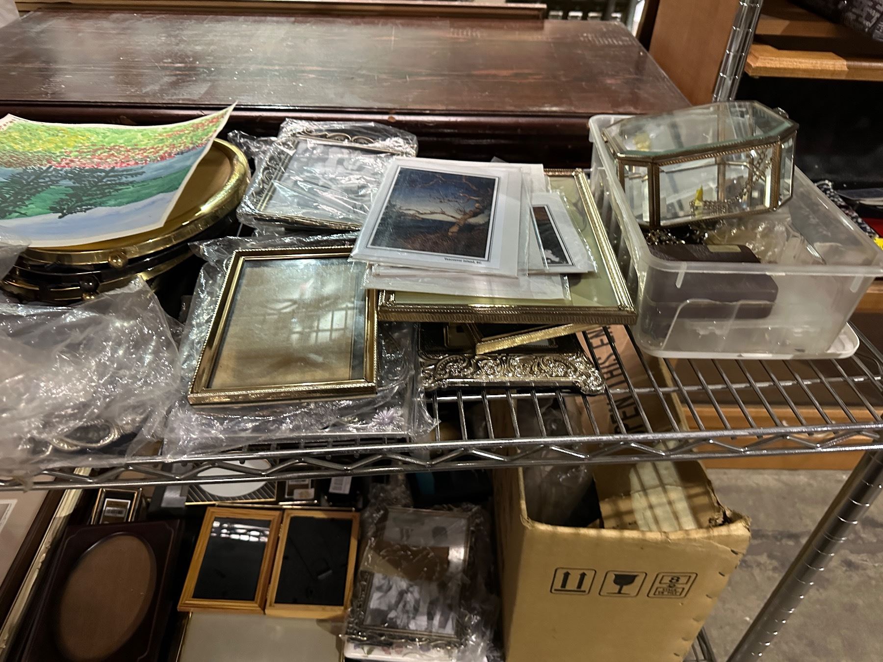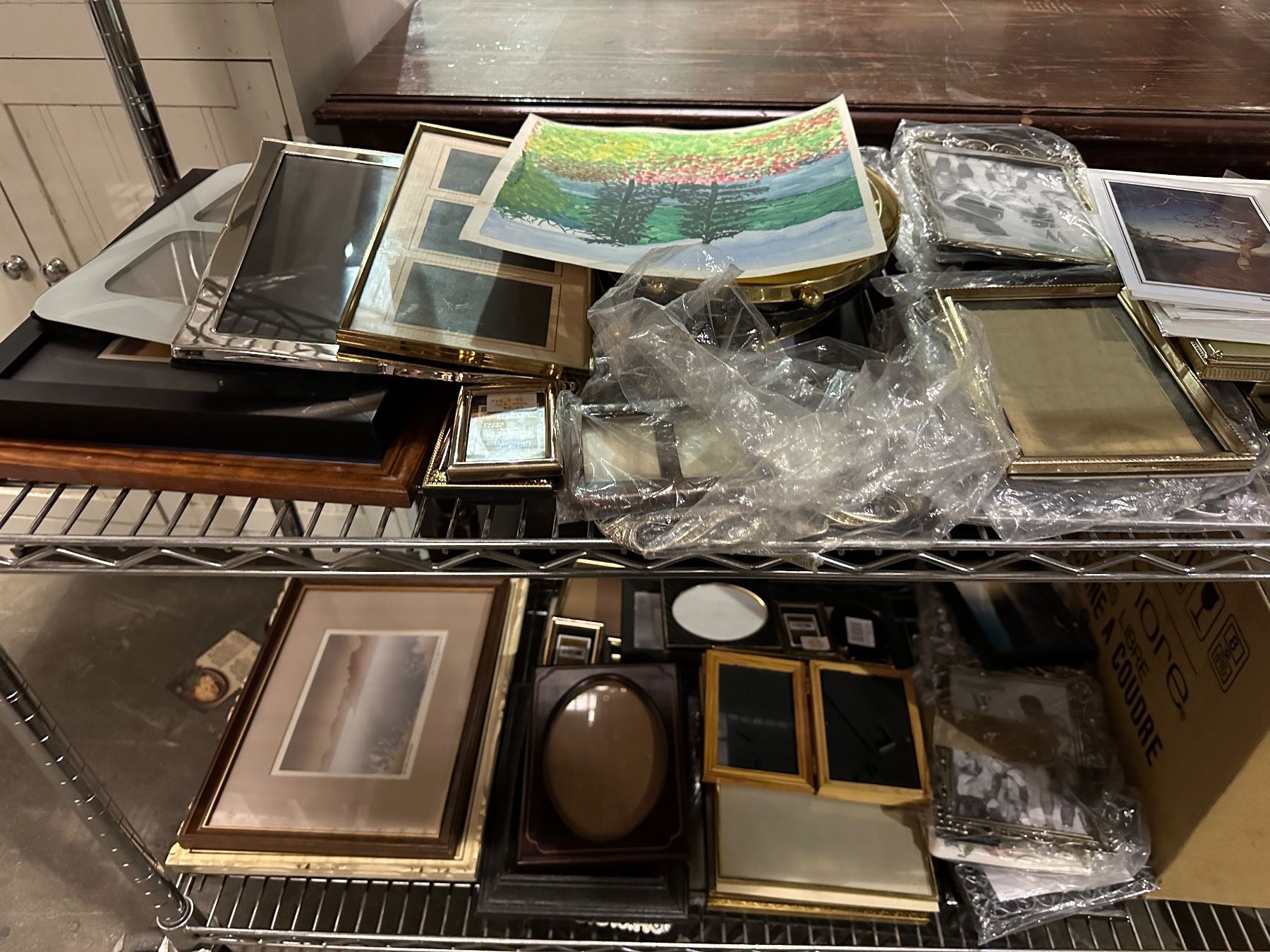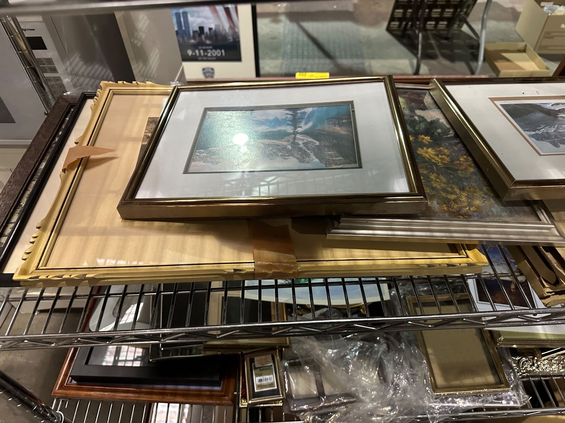 4 shelves of misc pictures, framed pictures, frames, etc...
