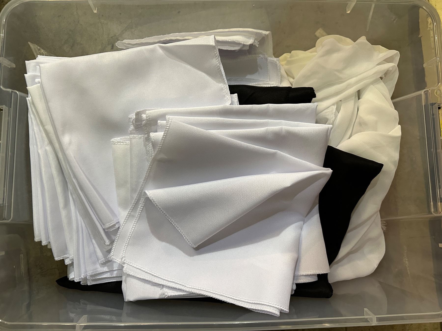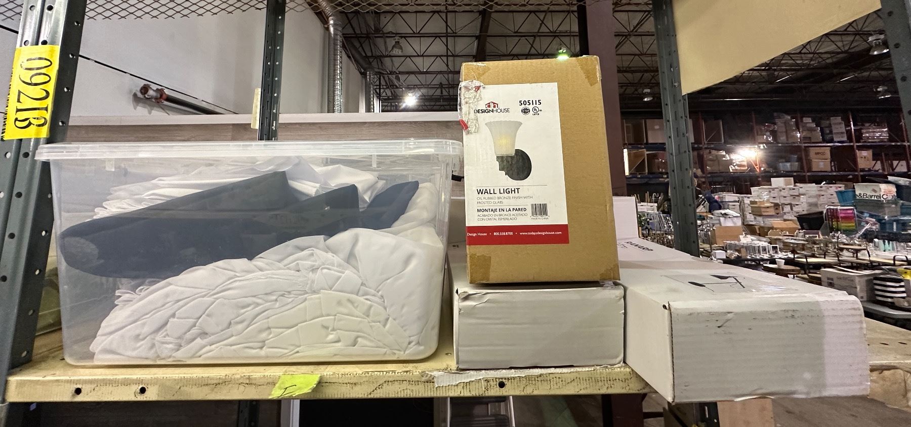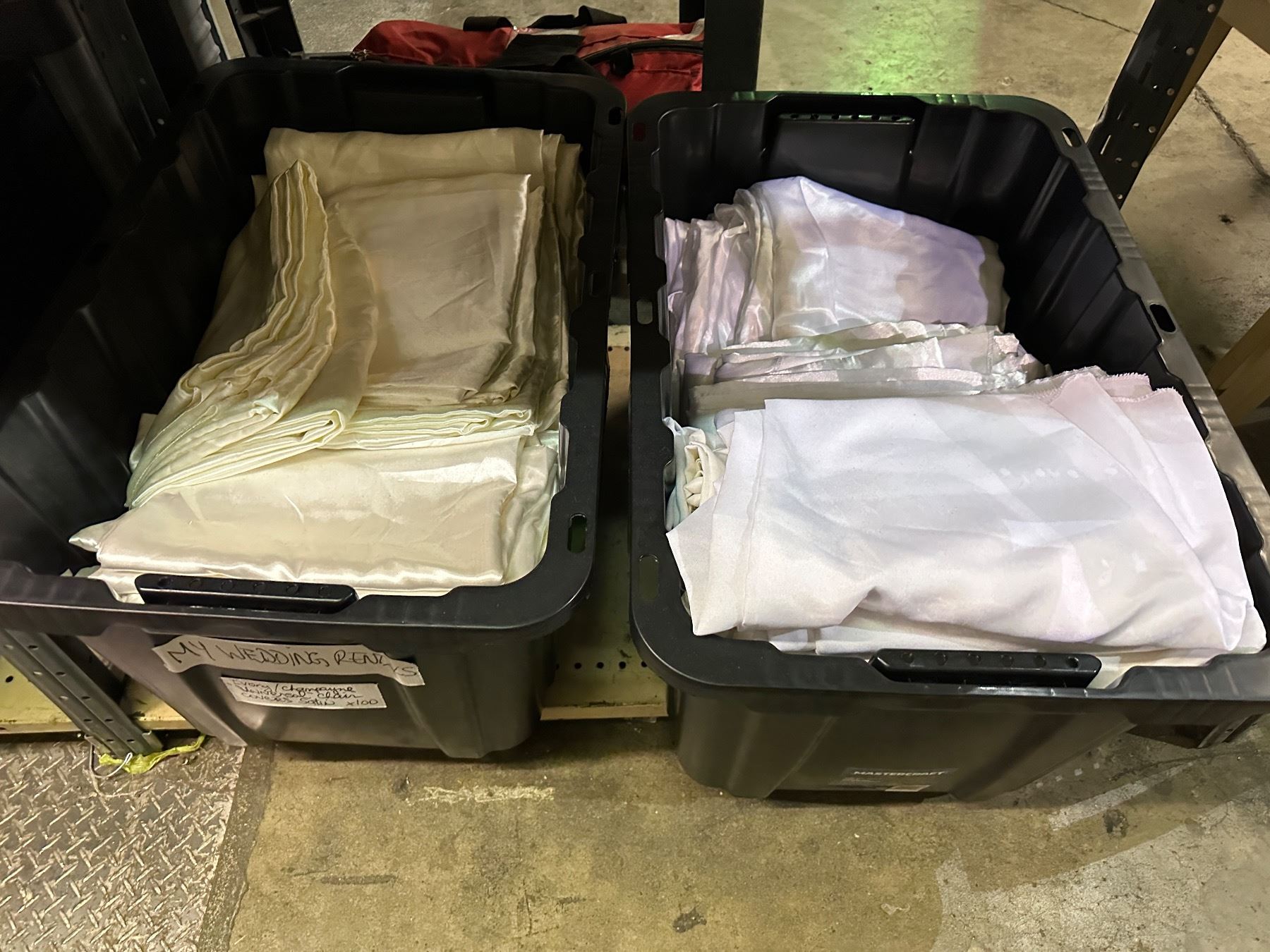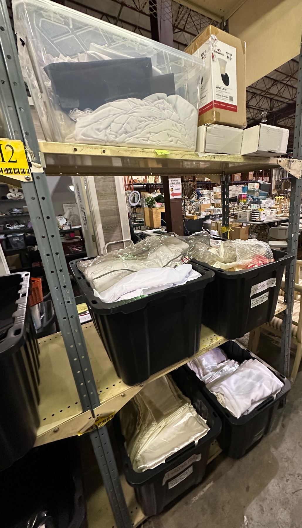 4 shelves of white/beige chair seat covers, wedding aisle runaway, wall lamp oil rubbed bronze finish, desk lamp, bins, etc...
