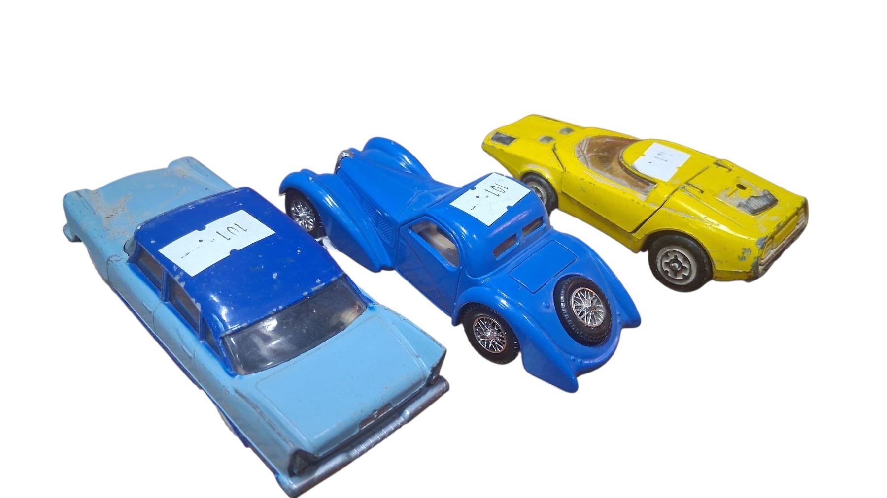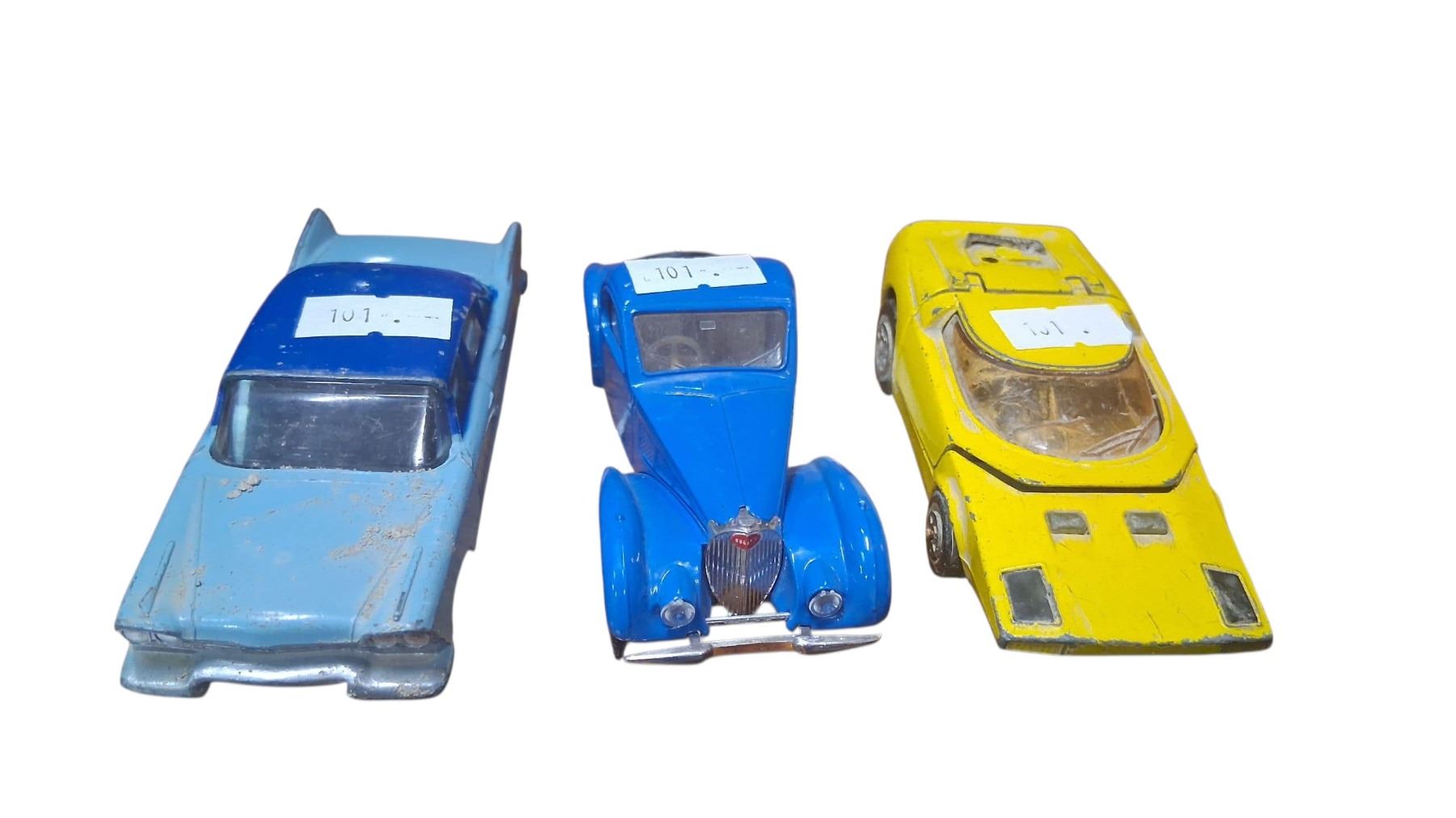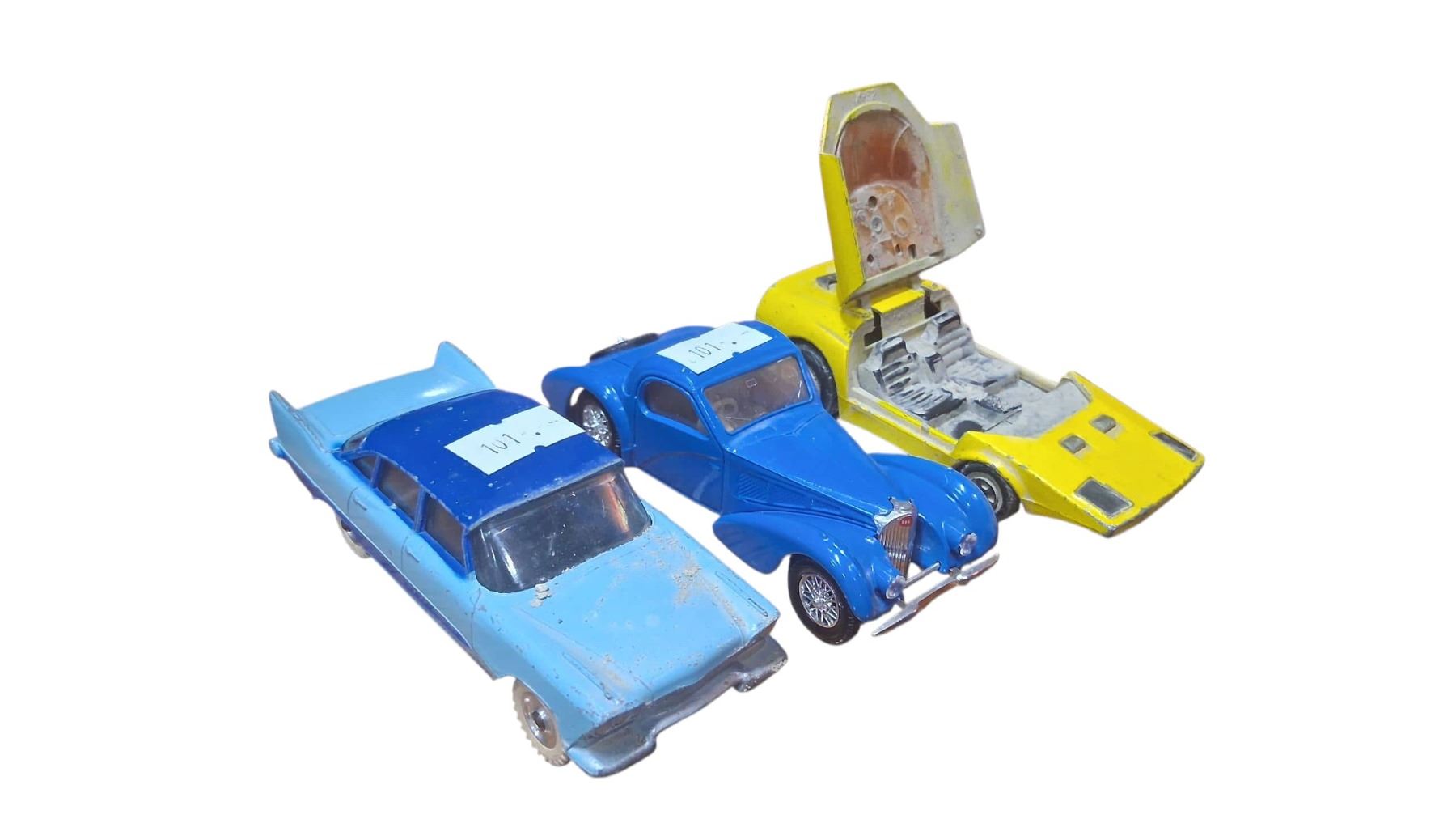3 vintage die cast cars, 1:43 scale, Matchbox Shovel Nose, Bugatti & Plymouth
