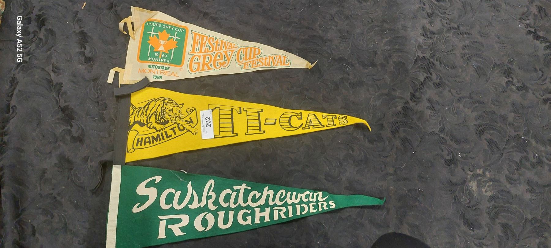 3 vintage pennants, Sask, Hamilton, Grey Cup