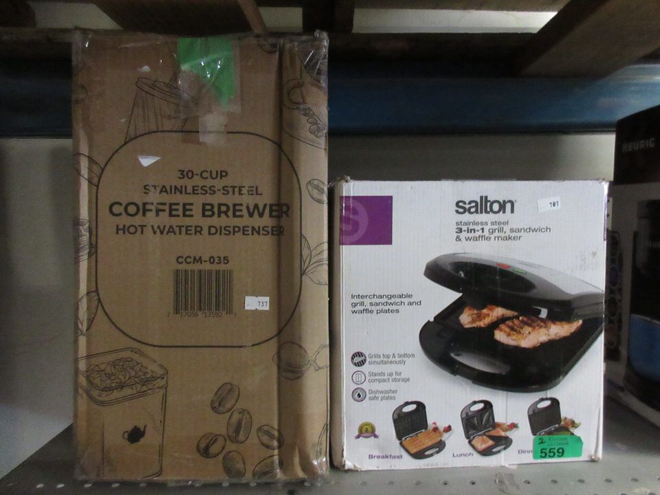 30 Cup stainless steel coffee brewer/hot water dispenser & Salton 3-in1 grill, sandwich maker & waffle maker. Customer returns.