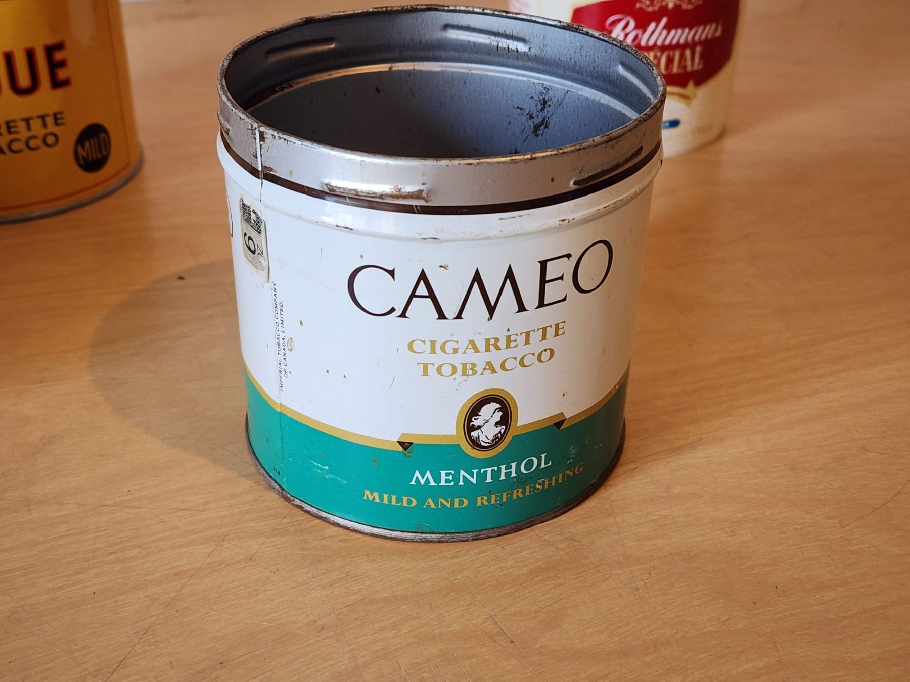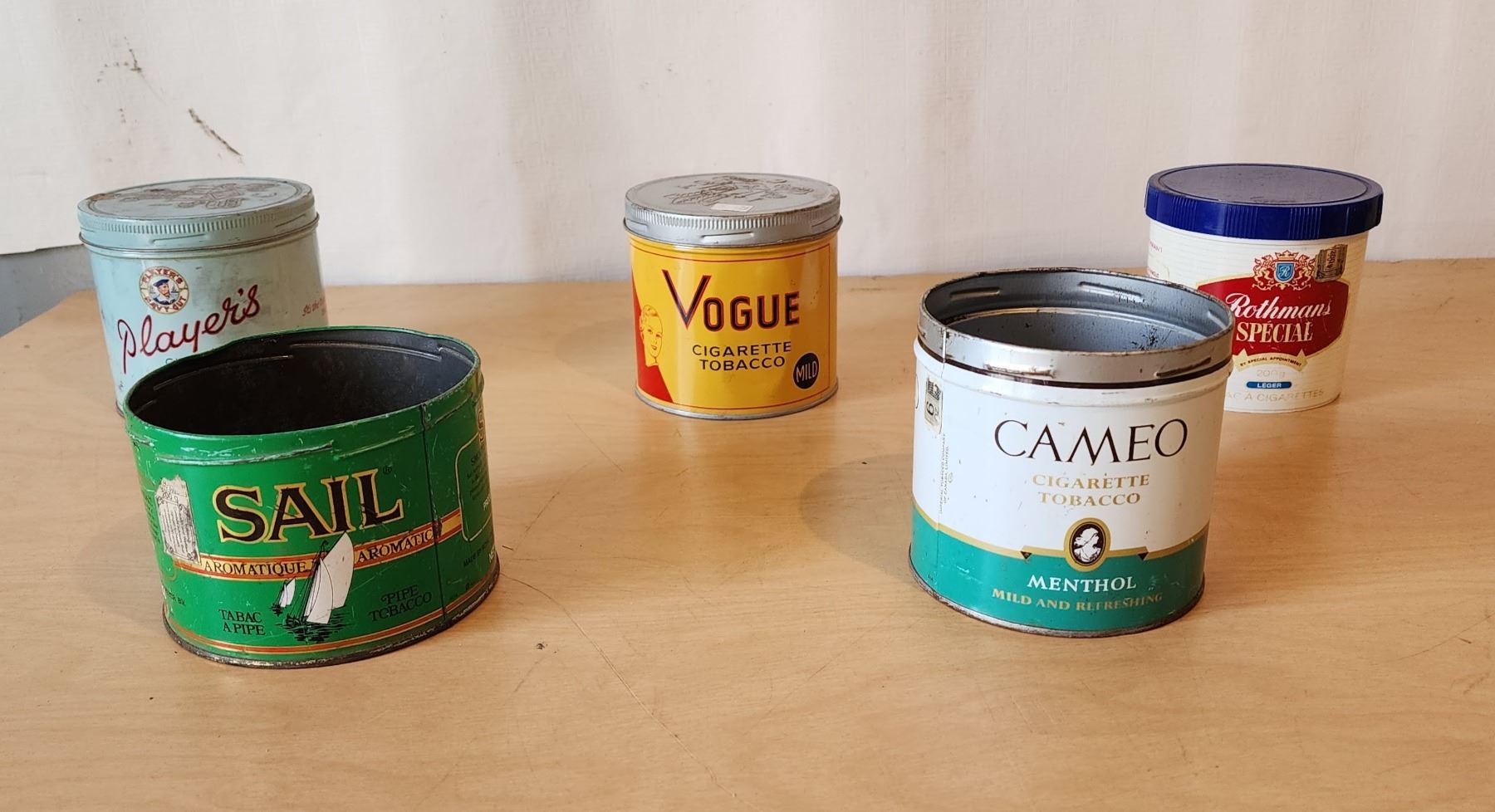 300 -- 7 VINTAGE CIGARETTE TINS, 1930'S ENAMEL BOTTLE VINTAGE BLUE LABEL TEA TIN AND MORE