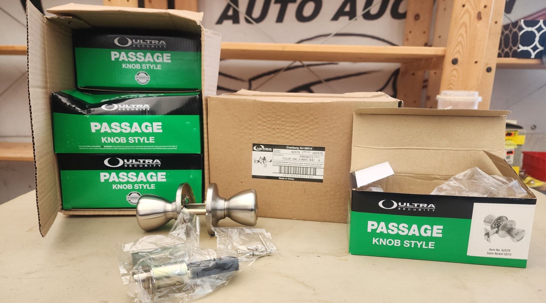 302 -- ULTRA SECURITY PASSAGE AND PRIVACY STYLE DOOR KNOBS IN SATIN NICKLE(SIX EACH)