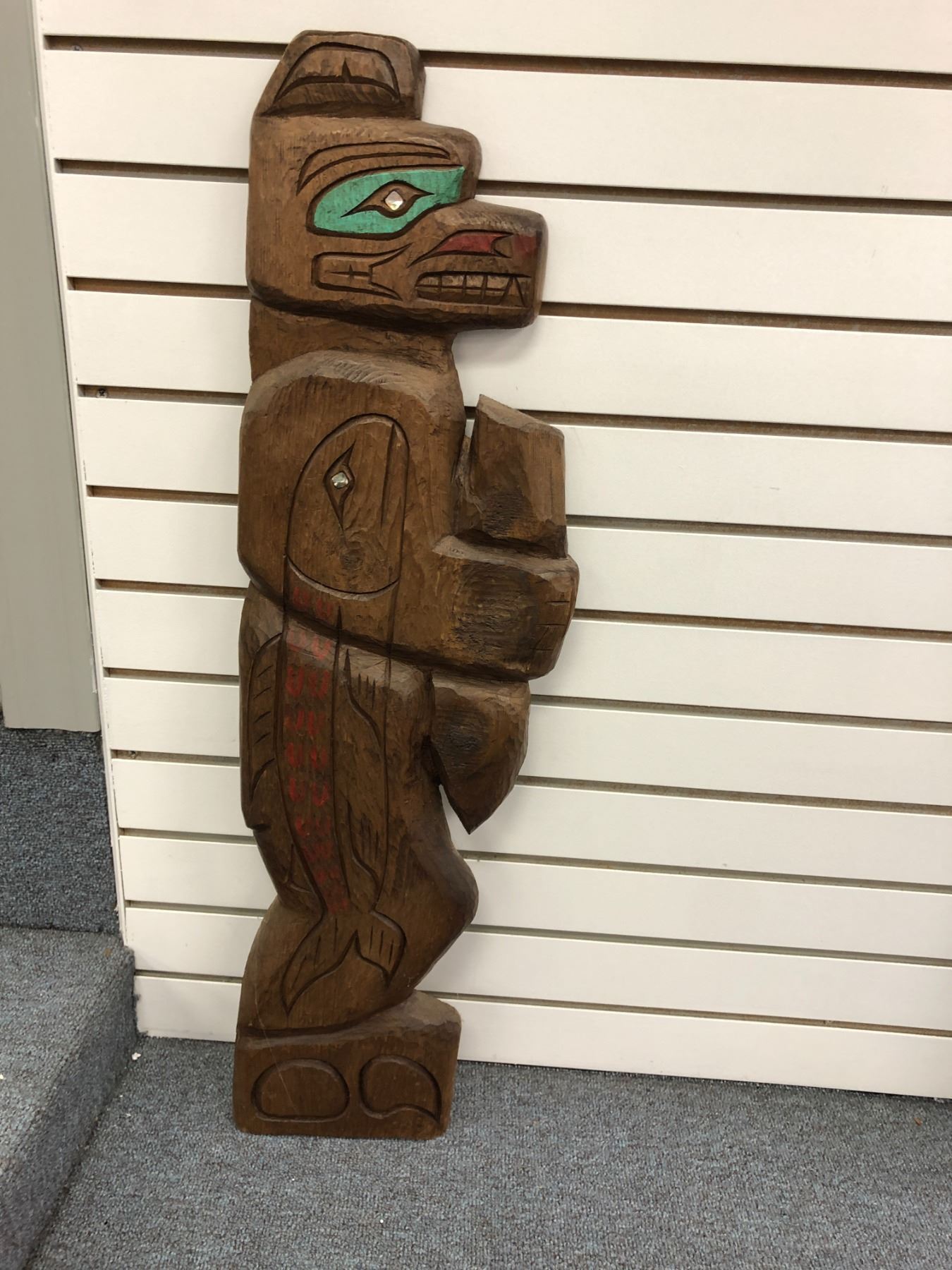 33in West Coast First Nations wood carving w/ abalone eyes "Bear & Salmon" signed Telqua 1998