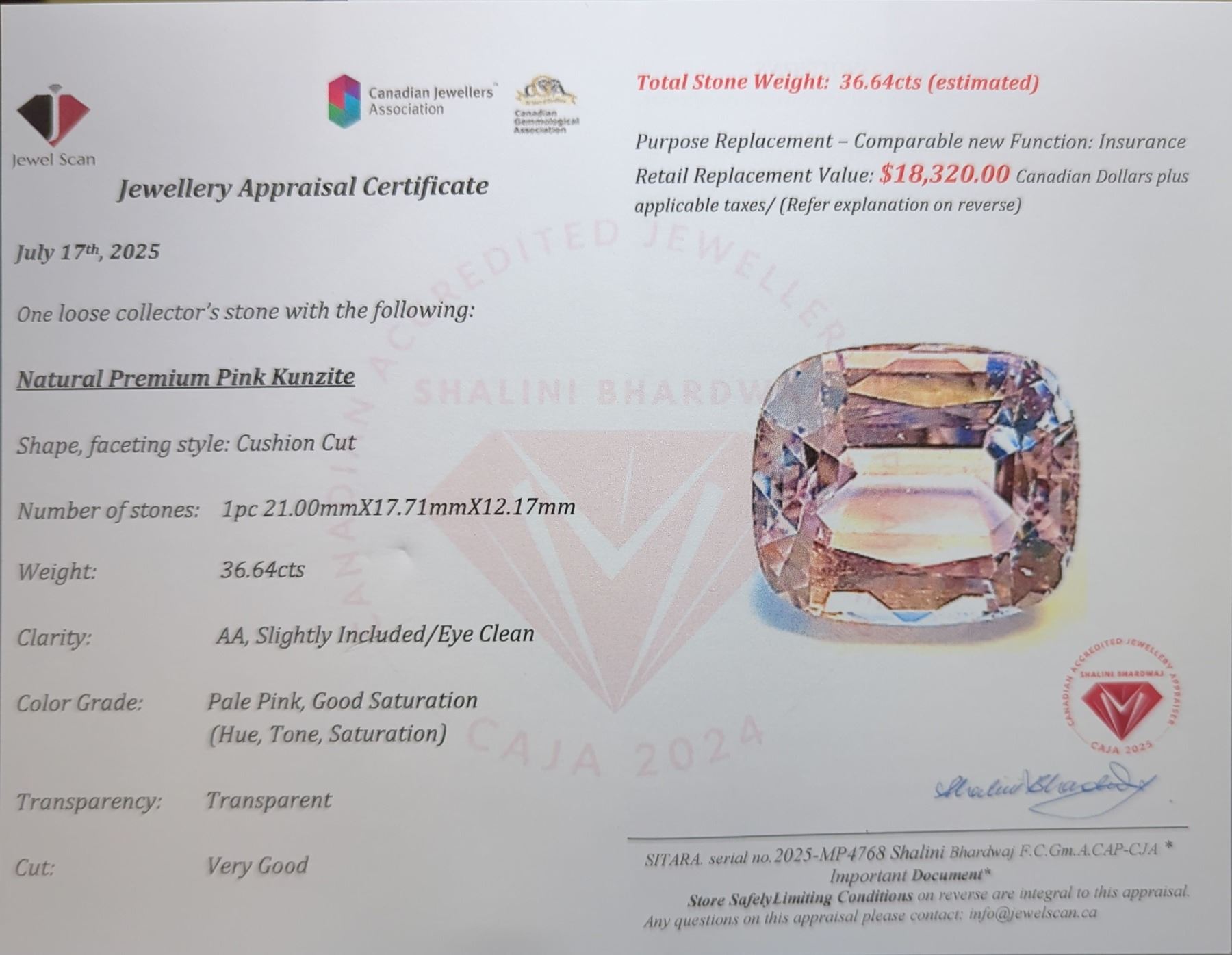 36.64 ct Certified Pink Kunzite gemstone ($18,320 Appraisal)