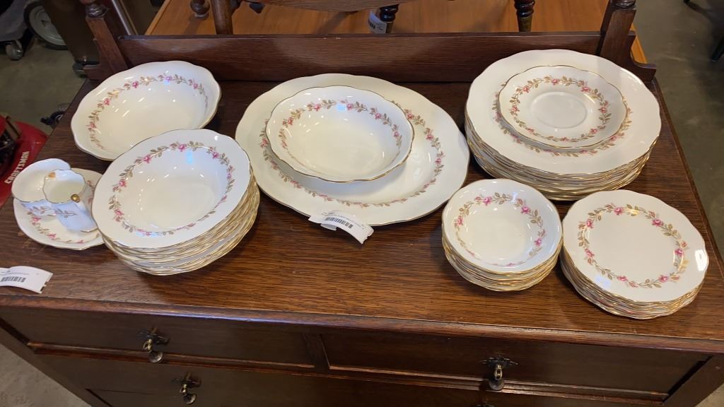 39 PIECES ROYAL ALBERT MINUET CHINA - 8 DINNER PLATES, 8 SIDE PLATES, 8 SOUP BOWLS, 8 FRUIT BOWLS, SERVING PLATTER, 2 SERVING DISHES, CREAM AND SUGAR W/ DISH, AND GRAVY PLATE