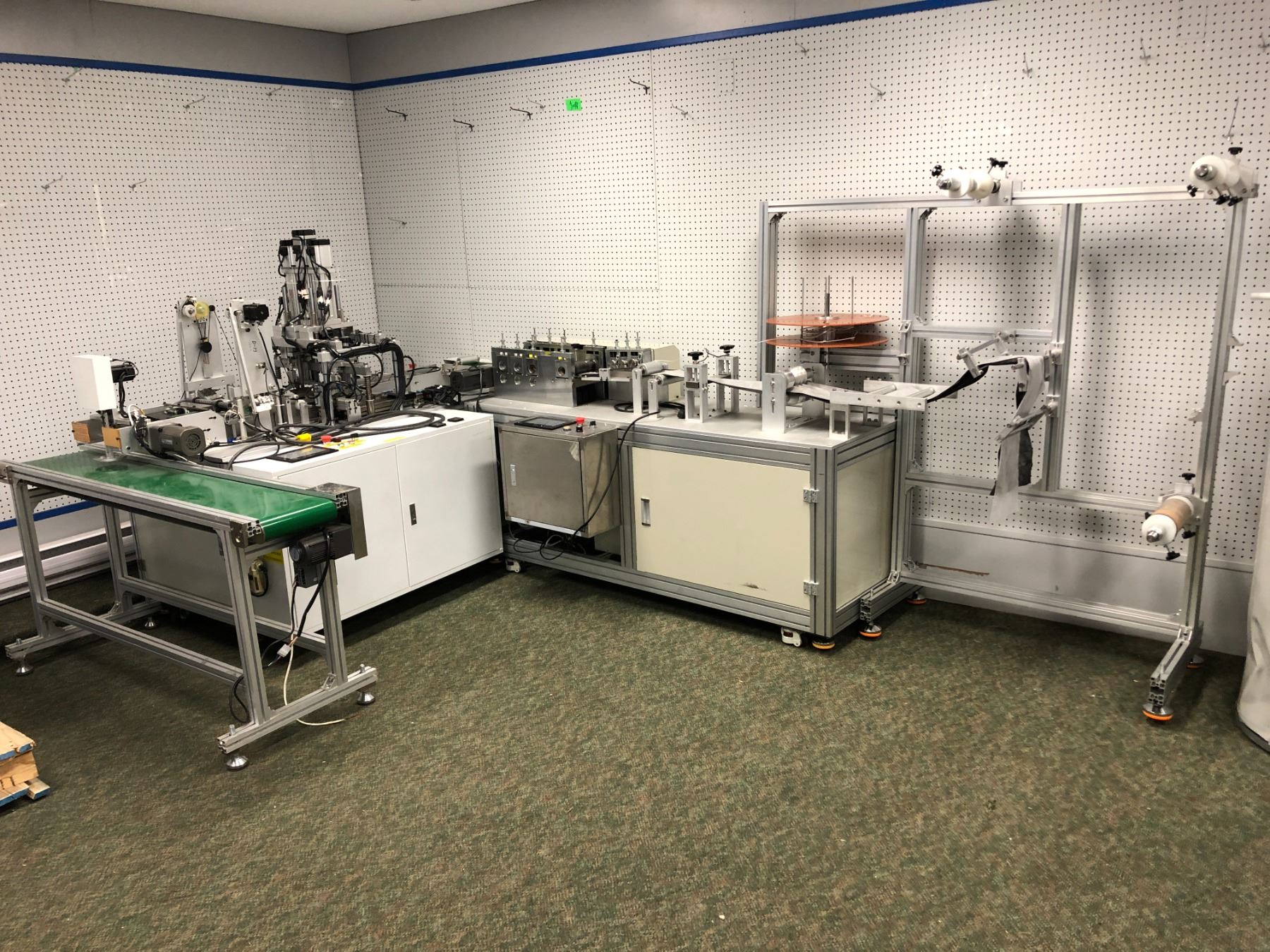 3pc Commercial Mask Production System - include mask making machine/ mask ear loop machine/ approx. 59in conveyor - electronic components include control panels/ motors/ ultrasonic generators (like new 2020-2021)