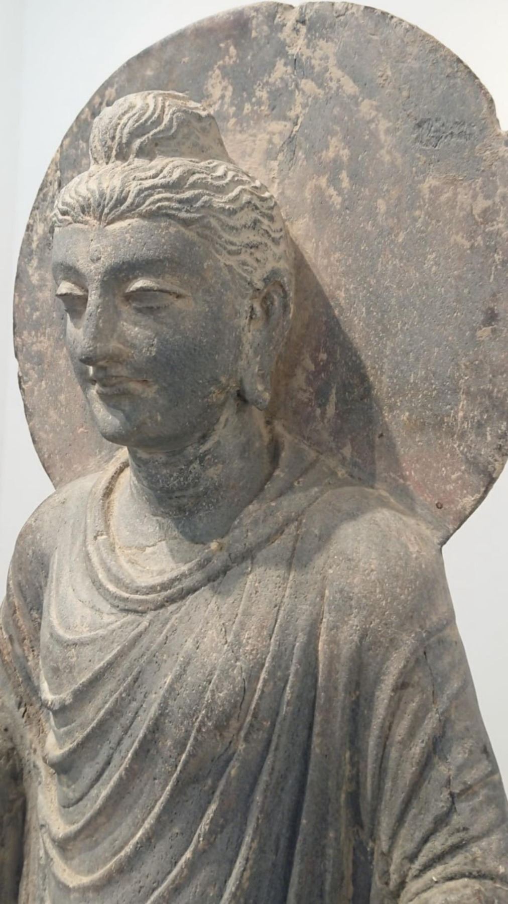 A Large Grey Schist Figure of a Standing BuddhaGandhara, 2nd / 3rd Century.Superbly, carved standing on a plinth with worshippers flanking a stupa, wearing voluminous robes with cascading fold, his left hand lowered, his face in benevolent expression woth crisply delineated features and elongated earlobes, his hair arranged in fine locks rising over the ushnisha, his face backed by a smooth nimbus.With the growing popularity of Mahayana Buddhism around the 2nd century, large detached images were sculpted alongside narrative friezes. This is surely excited sculpture of a standing Buddha is characteristic for high point if ghandhran art, among the very best in terms of refinement in carving and in an excellent state of preservation. Buddha wears monastic garments, very elegantly draped across both shoulders, wrapped around the arms and revealing further undergarments. The fingers of the pendant left hand are very finely carved and polished, as are the facial features. The undulating strands of hair and curls of top knot are extremely finely detailed.Height 88 CM;