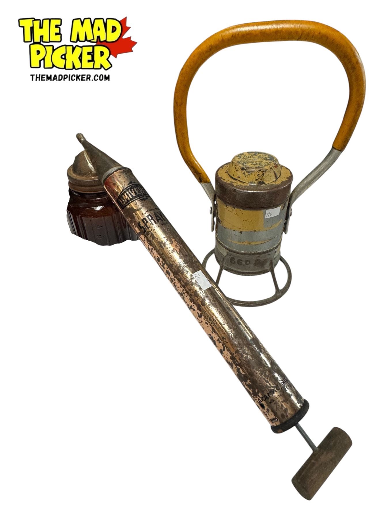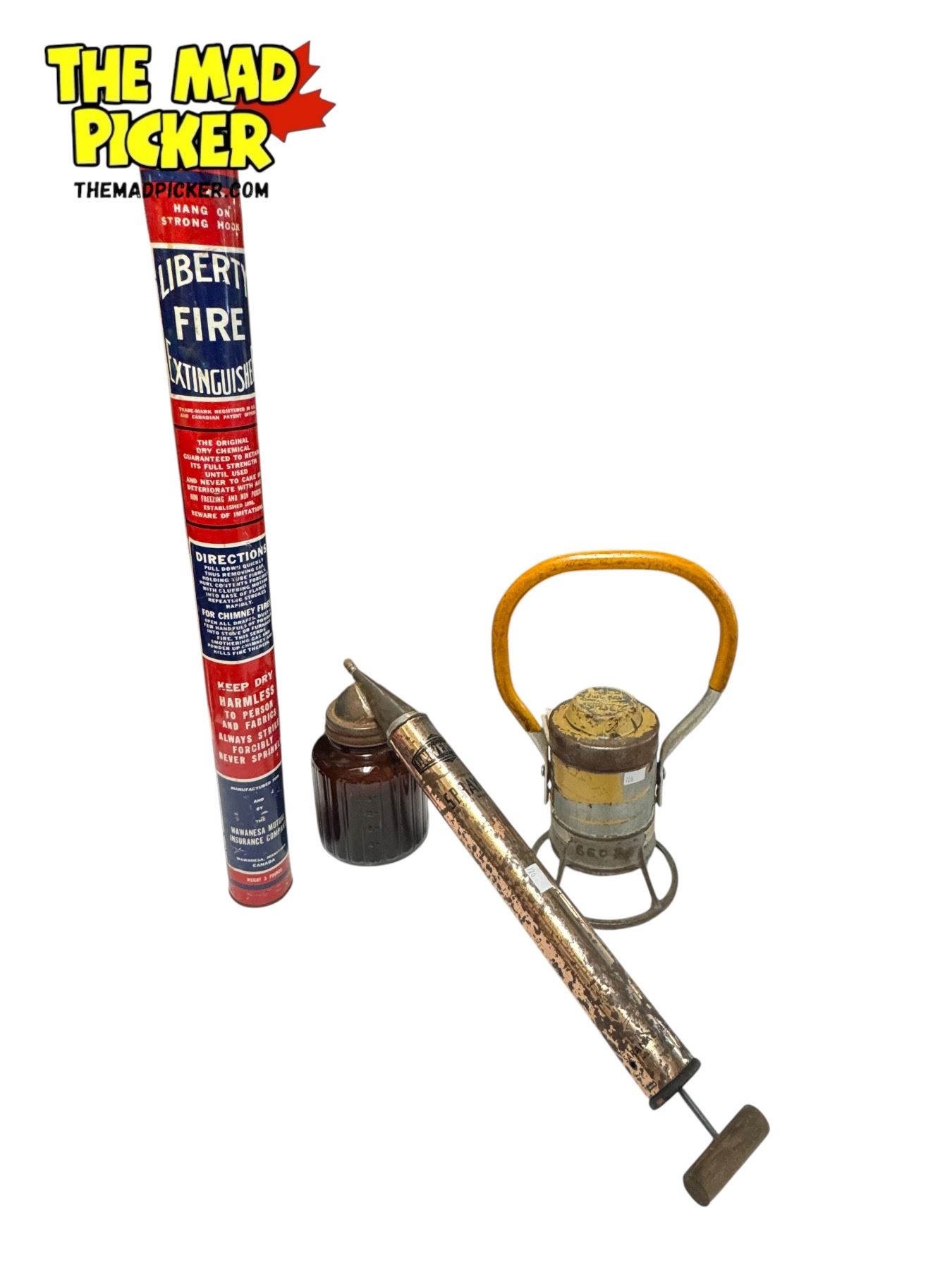 3x Vintage Collectibles: Liberty Fire Extinguisher, Universal Spray With Original Amber Glass Container, & Miners Lamp