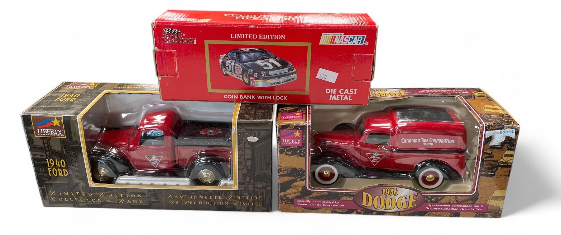 3x Vintage Die Cast Car Coin Banks: Canadian Tire & Nascar Racing Champions